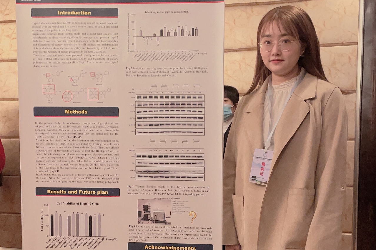 Miao Lingchao, a PhD student, presented a systemic investigation on the biological activities and mechanisms of six flavonoids (Apigenin, Luteolin, Baicalein, Baicalin, Vitexin and Isoorientin) and how they can improve the high-glucose and dexamethasone induced insulin-resistance in HepG-2 cells. Simultaneously, she investigated the metabolisms of the six flavonoids by the insulin-resistant HepG-2 cells in order to find the appropriate methods to improve their bioavailability as well as the biological activities. Mio received a Best Poster Award