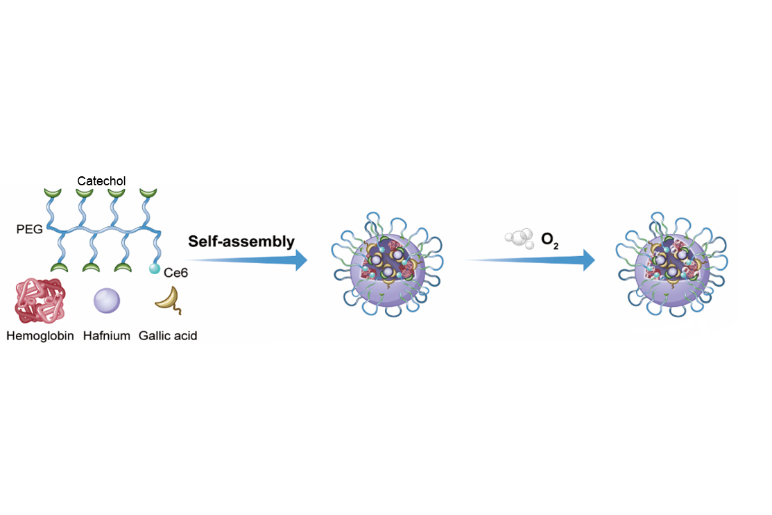 Hb@Hf-Ce6 nanoparticles are prepared based on the structure of metal polyphenol coordination, which integrates all functional molecules into nanoparticles to achieve multifunctional anti-tumour effects. The polyphenol structure modified by chlorin e6 (Ce6) is coordinated with high-Z radiotherapy sensitisers (hafnium, Hf), and the oxygen carrier hemoglobin (Hb) is chimeric in the coordination structure to overcome radiation tolerance associated with hypoxia. Specifically, under X-ray radiation, the radiation-induced physical process stimulated by Hf can activate the photosensitiser Ce6, thereby generating high levels of ROS to induce cancer cell damage.
