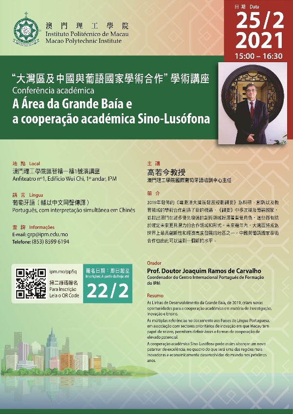 With the aim of analyzing and promoting new opportunities initiated by the Development Plan for the Guangdong-Hong Kong-Macao Greater Bay Area, Professor Joaquim Ramos de Carvalho, Director of the International Portuguese Training Centre of Macao Polytechnic Institute (MPI), will deliver a lecture on the Greater Bay Area and the future of academic cooperation between China and the Portuguese speaking countries.