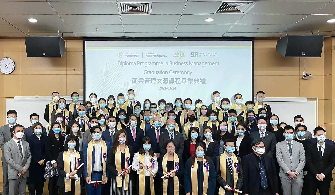 A one-year diploma programme in business management, co-organised by the University of Macau’s (UM) Centre for Continuing Education (CCE) and Sands China Ltd, has ended with success. Recently, the CCE and Sands China held a graduation ceremony for the fifth (2018-2019) and sixth (2019-2020) cohorts of students who completed the programme. A total of 46 graduates received certificates.