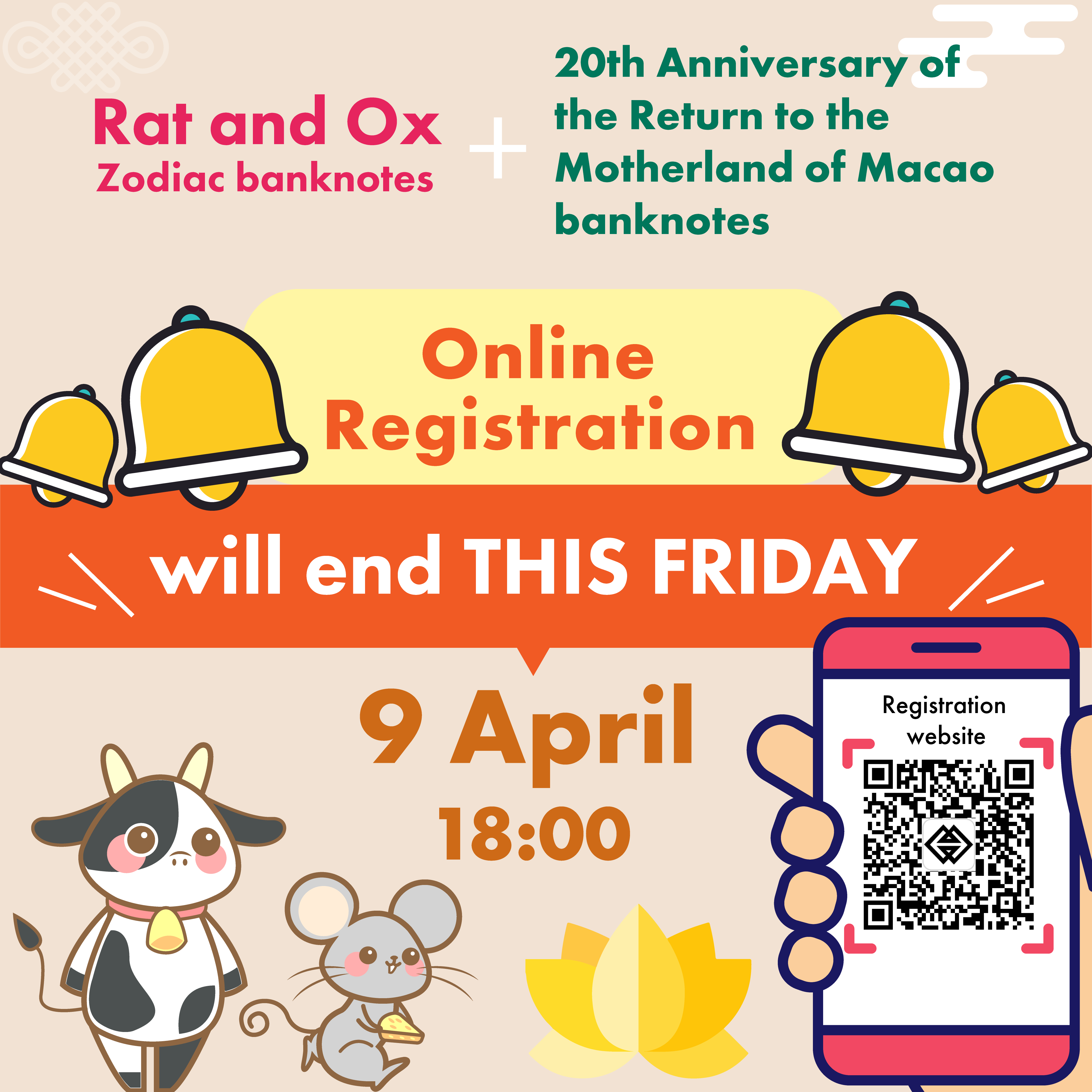 The online registration period for the exchange of the Rat and Ox Zodiac banknotes and the previously issued 20th Anniversary of the Return to the Motherland of Macao banknotes will end at 6:00pm on 9 April 2021 (Friday). The Monetary Authority of Macao would like to remind those citizens who are interested in exchanging for the said banknotes to complete the registration process before the mentioned deadline.