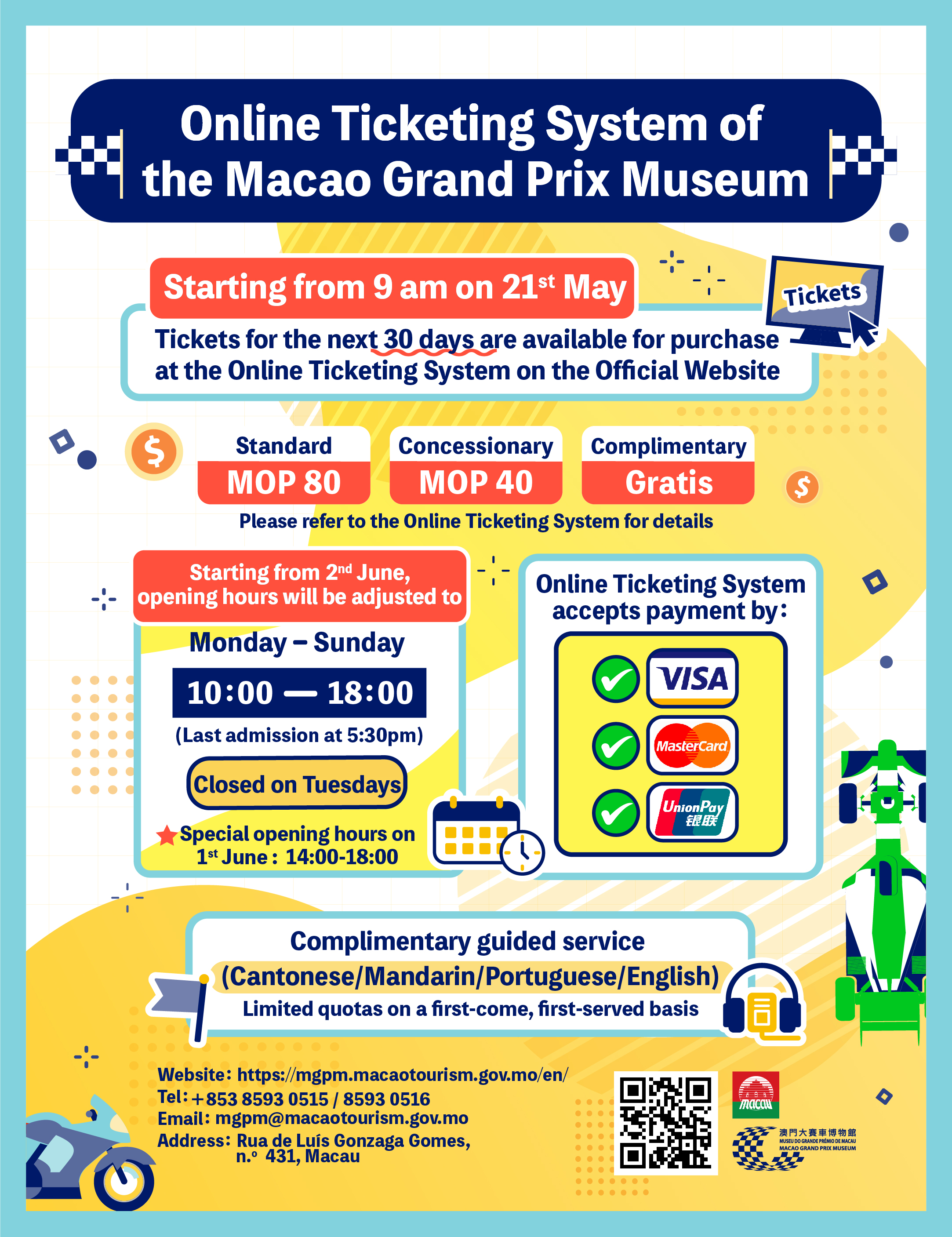 The Macao Grand Prix Museum will officially open starting from June. For residents’ and visitors’ convenience to schedule visits in advance, the Museum now optimizes its ticketing arrangements on the official website. Starting from 9 a.m. tomorrow (21 May), admission tickets can be purchased online 30 days in advance and up to one day before the visit.