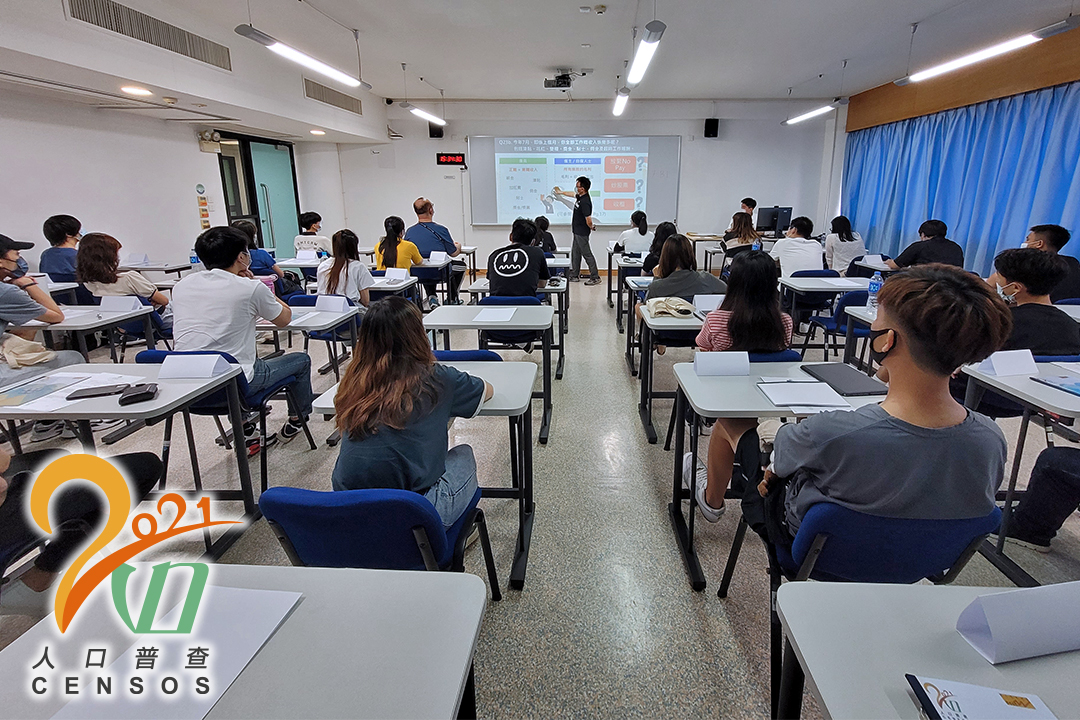 The recruitment of temporary workers for the Population Census was conducted online in February this year. Job positions include field workers whose main duties are to collect census data through field visits, Census Hotline operators and other internal workers. More than 3,400 applicants completed the registration and passed the online test and the video interview for the recruitment. Training for temporary workers is divided into two phases. In the first phase, participants receive online training to gain a basic understanding of the Population Census through online learning materials. Participants who completed the first phase and passed the online test can proceed to the second phase for classroom training.
