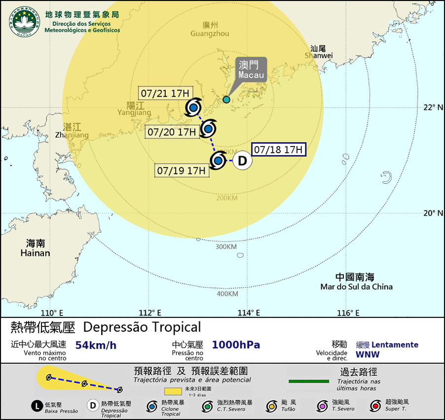 The low pressure area over the northern part of the South China Sea has intensified into a tropical depression. Although the circulation of the tropical cyclone is relatively small, it is expected to linger within 200 km south of Macao and may further intensify in the next two or three days. Its related rainband will bring unsettled weather to Macao, with heavy showers and the winds will strengthen in the next few days. The development of the tropical cyclone will be closely monitored. Meanwhile, as it will not be in the high phase of astronomical tide on 19th and 20th , the possibility of storm surge will be low, the public should pay attention to the latest weather information.