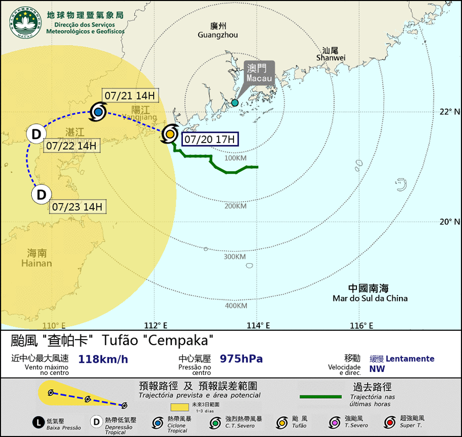 Typhoon Cempaka still slowly moved towards the coast of Yangjiang. Under the influence of its outer rainbands, occasional strong winds and heavy showers are still expected in Macao in the next following hours. Cempaka is forecasted to make landfall in the vicinity areas near Yangjiang soon. As long as it further moves away from Macao and the chance of being affected by strong winds in Macao becomes less, Tropical cyclone signal no. 1 will be considered to replace signal no.3 tonight. Yet, Cempaka will still linger around the west coast of Guangdong in the next two or three days. As the track of Cempaka is still uncertain, the public is advised to stay alert and pay attention to the latest storm news.