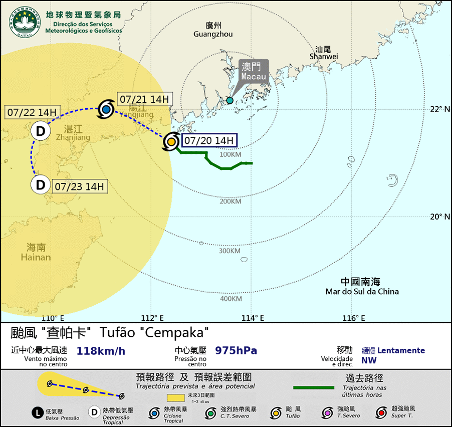 Typhoon " Cempaka " slowly moved towards the coast of Yangjiang. Under the influence of its outer rainbands, there will be occasional strong winds and heavy showers in Macao during the daytime. The public is advised to pay attention to the possibility of flooding caused by the heavy showers.