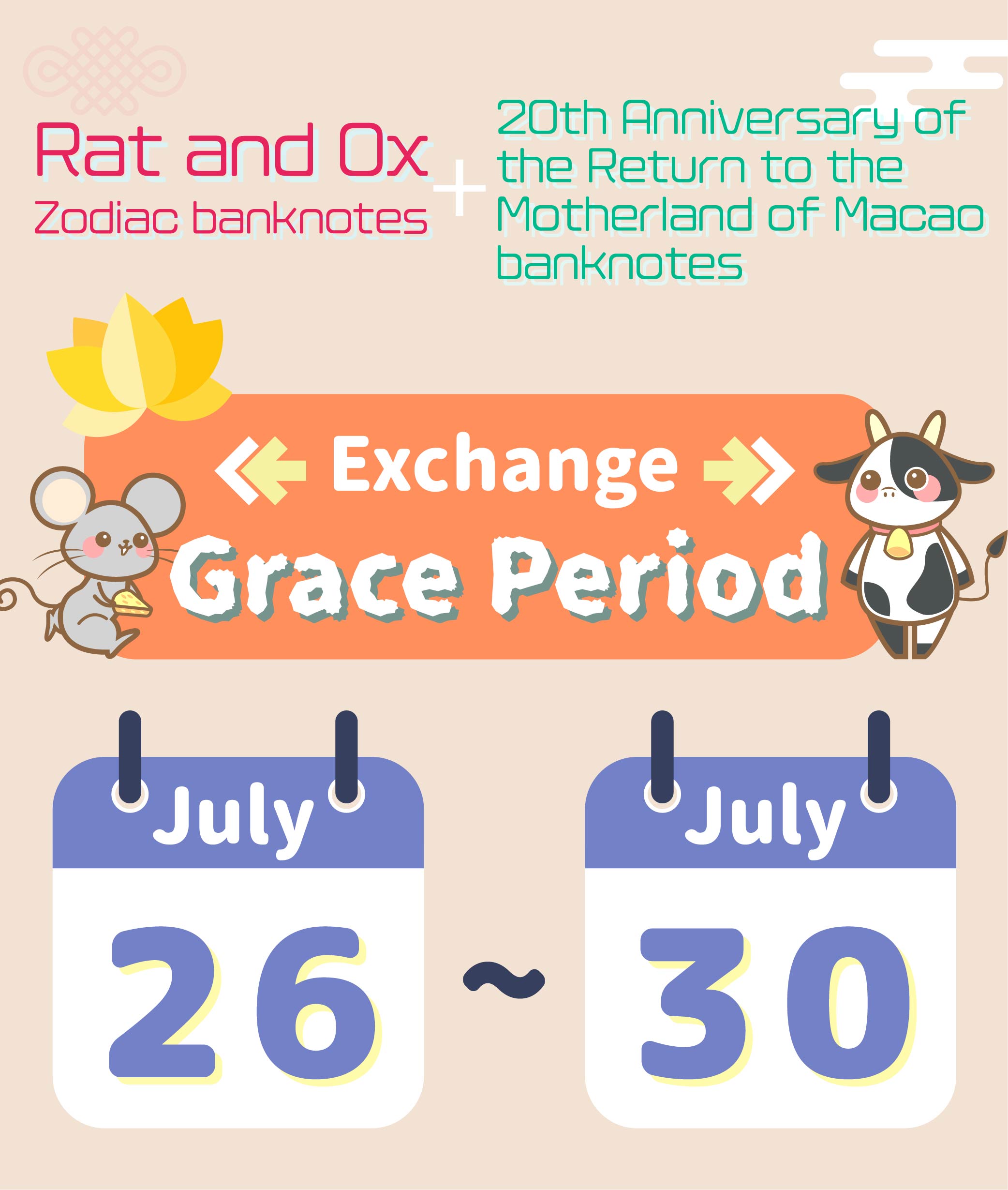 As scheduled, the exchange period for the Rat and Ox Zodiac banknotes and the previously issued 20th Anniversary of the Return to the Motherland of Macao banknotes will end on 23 July 2021 (Friday). For the convenience of those registrants who have not yet conducted the note exchange, a grace period will be granted between 26 July 2021 and 30 July 2021 to allow for the exchange of their subscribed notes at their previously selected bank.