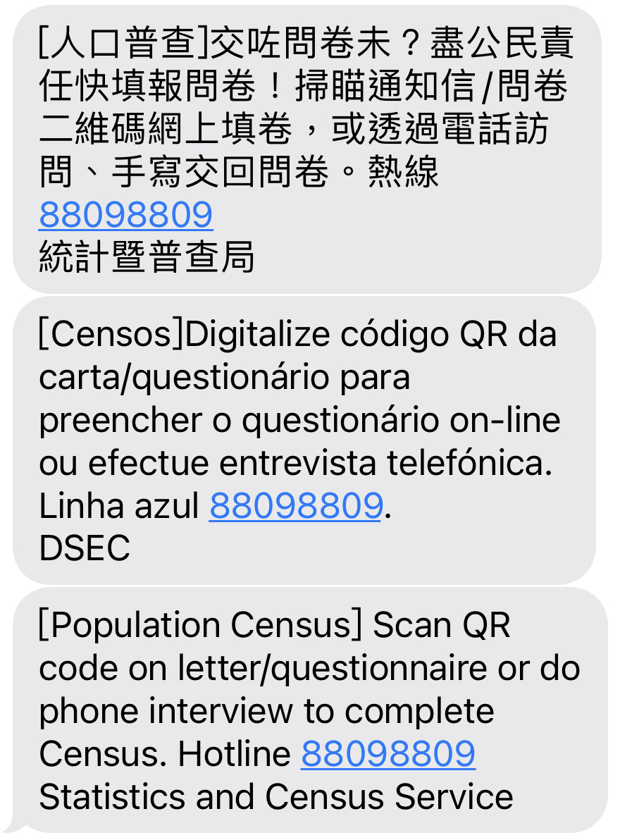 DSEC will start sending text messages to residents tomorrow (13 Aug) to remind them to submit the questionnaire. The text message does not serve as a means to collect information from households, but only as a way to appeal to the public to complete the online questionnaire, return the completed paper form or conduct a telephone interview via the Census Hotline at 8809 8809.