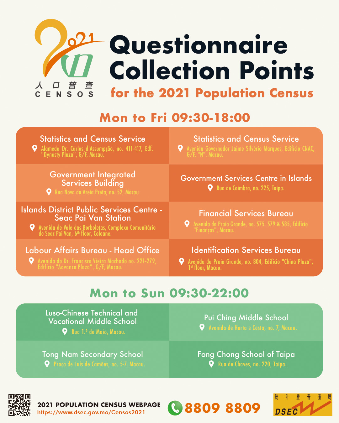 To encourage early completion of the Census questionnaire, DSEC is holding “Early Census Response for Greater Chance of Winning Lucky Draw”. For more information about the Census, please visit the webpage of the 2021 Population Census ( https://www.dsec.gov.mo/Censos2021 ) or call the Census Hotline at 8809 8809.