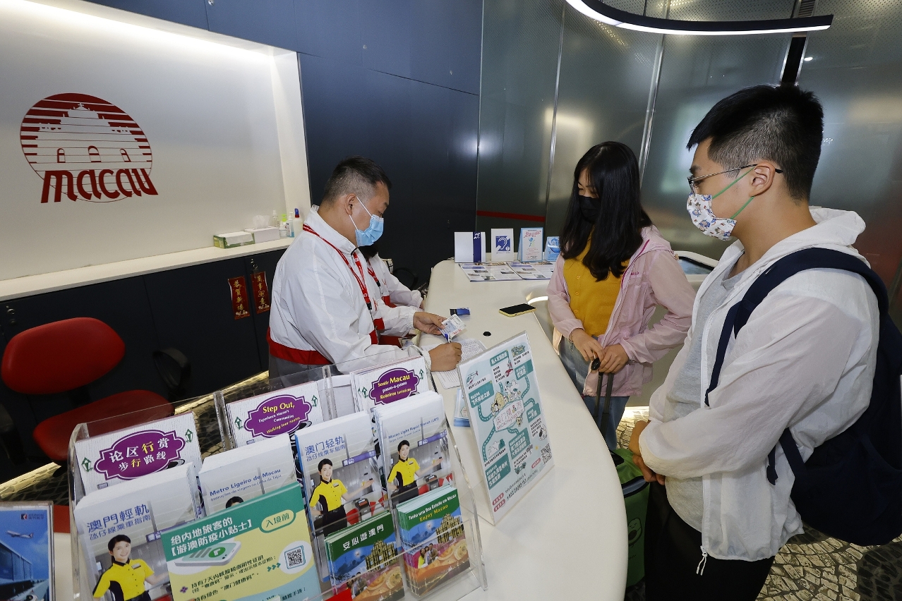 Staffers offer travel info at MGTO’s Tourist Information counter at Macau International Airport