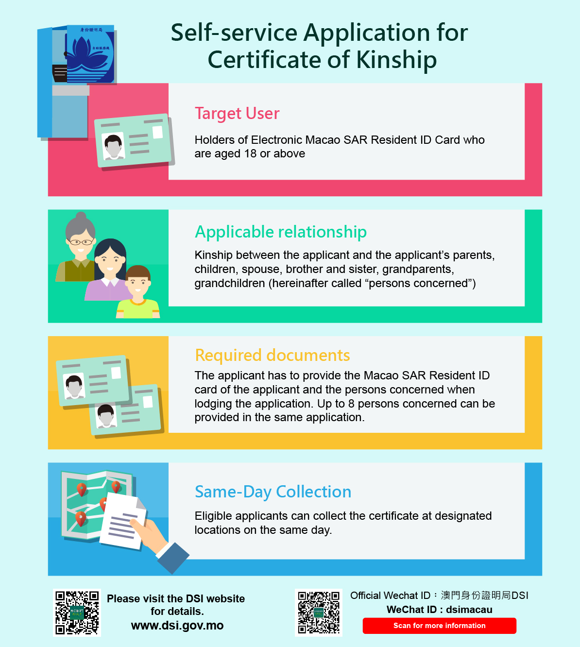 In order to continuously extend the scope of self-service application, starting from 23rd September 2021, the Identification Services Bureau (DSI) launched 24-hour self-service application for the Certificate of Kinship. Macao residents can use self-service kiosk to apply for the Certificate of Kinship related to their parents, children, spouse, brother and sister, grandparents and grandchildren (hereinafter referred as “persons concerned”) anytime.