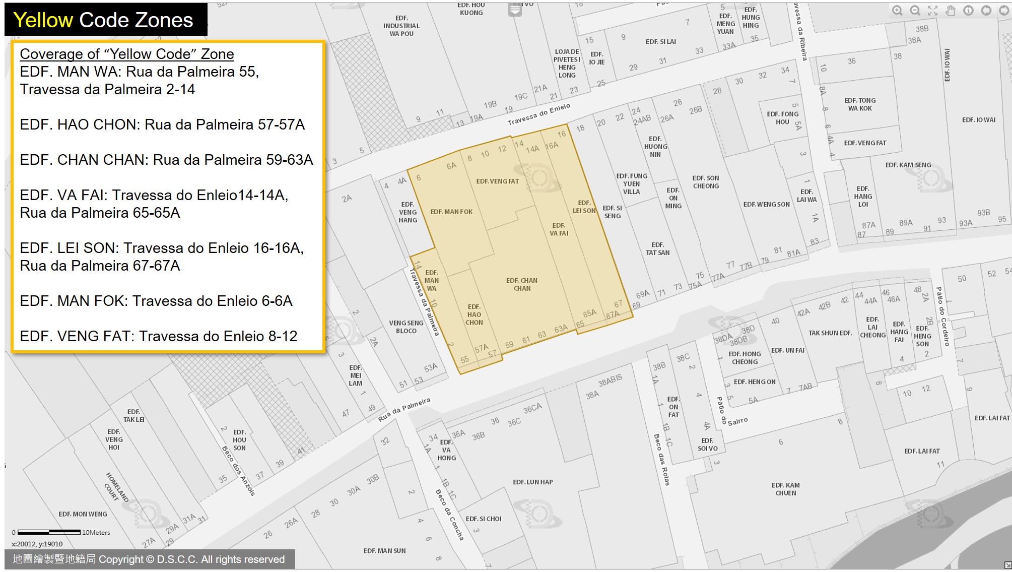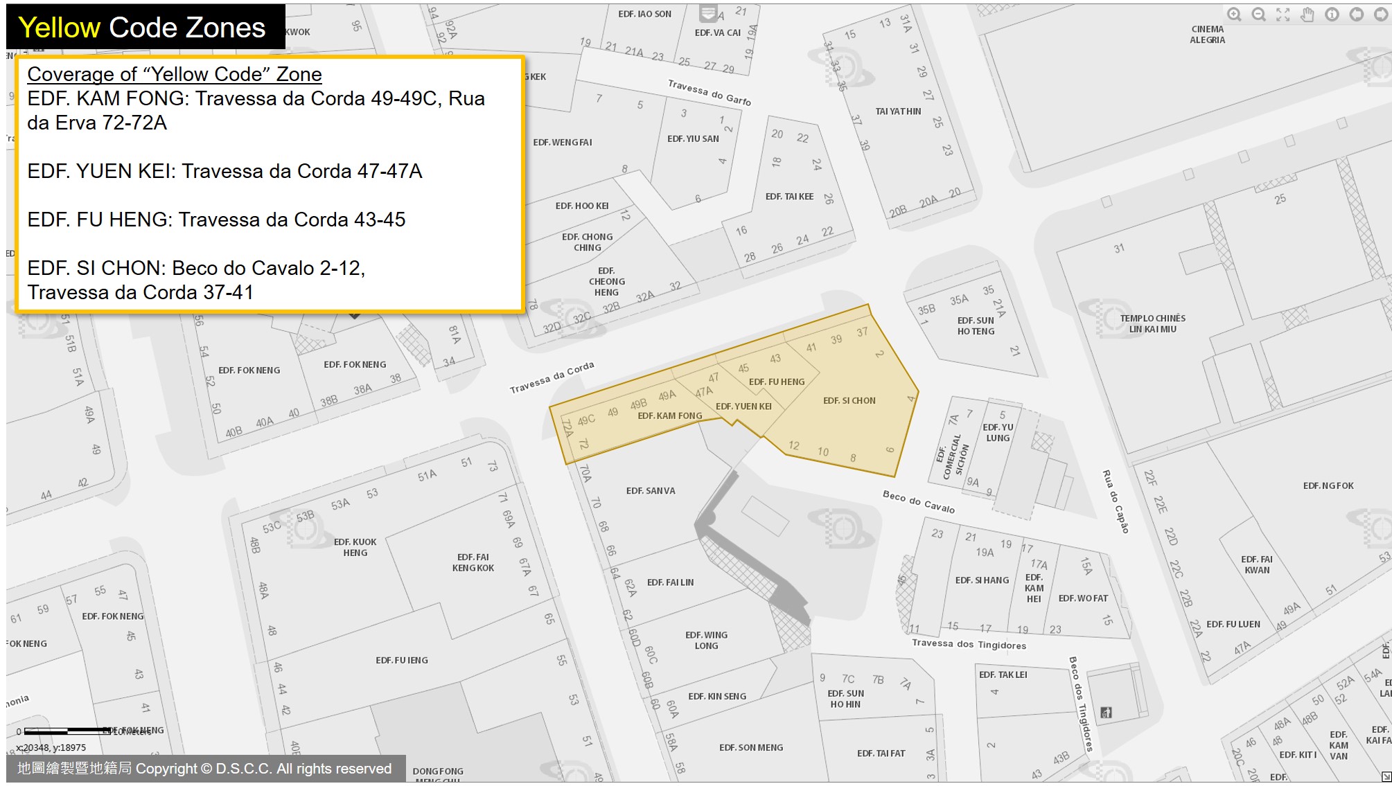 2)EDF. KAM FONG: Travessa da Corda 49-49C, Rua da Erva 72 - 72A; EDF. YUEN KEI: Travessa da Corda 47 - 47A; EDF. FU HENG: Travessa da Corda 43 – 45, Travessa da Corda 37-41.