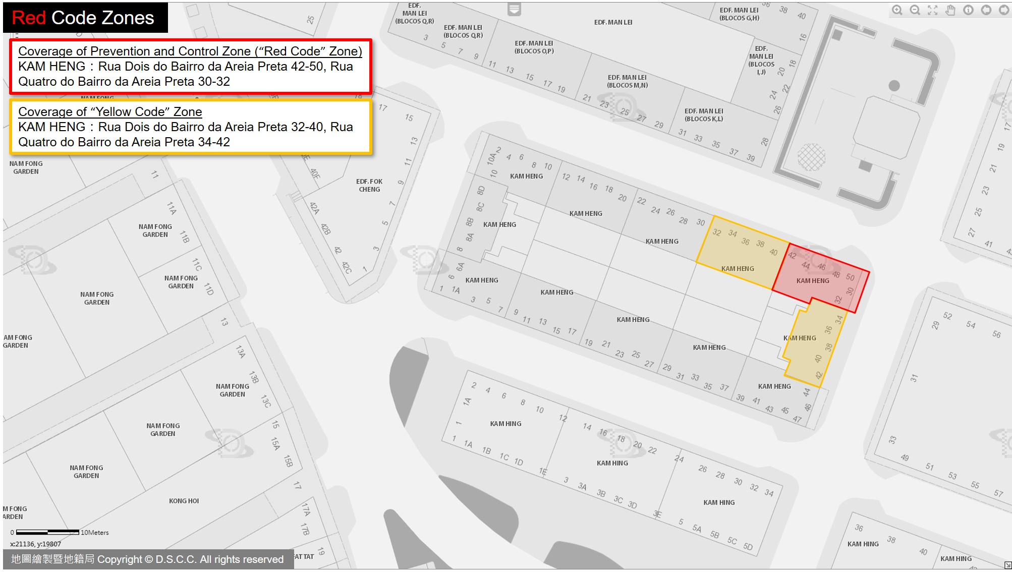 The coverage of the new Red Code Zone is as follows: KAM HENG at Rua Dois do Bairro da Areia Preta 42-50, Rua Quatro do Barro da Areia Preta 30-32. This area is subject to such control measures as on-the-spot nucleic acid testing and subsequent nucleic acid testing on a daily basis. Entry into the said area is permitted, but nobody except staff members is allowed to leave there. Individuals in this area should keep their activities to a minimum and collect supplies at the designated spot only. With comprehensive restriction and close-off management being in place, affected individuals may be quarantined for medical observation on site or be transferred to a suitable location for centralized management with medical observation according to the actual circumstances.
