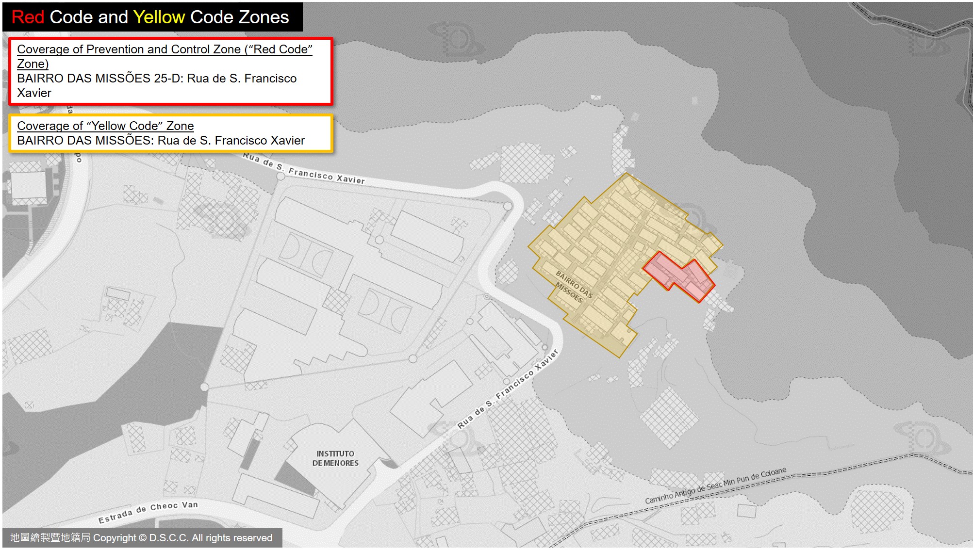 The coverage of the new Red Code Zone is the residence of the patient: Bairro das Missões 25-D at Rua de S. Francisco Xavier de Coloane. This area is subject to such control measures as on-the-spot nucleic acid testing and subsequent nucleic acid testing on a daily basis. Entry into the said area is permitted, but nobody except staff members is allowed to leave there. Individuals in this area should keep their activities to a minimum and collect supplies at the designated spot only. With comprehensive restriction and close-off management being in place, affected individuals may be quarantined for medical observation on site or be transferred to a suitable location for centralized management with medical observation according to the actual circumstances.