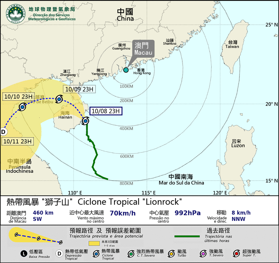 Tropical storm “Lionrock” has a broad circulation, passing through at a distance of about 500 km southwest of Macao between tonight and the early morning of 9th. It will move generally towards the area between Hainan Island and the Leizhou Peninsula. Under the combined influence of “Lionrock” and the northeast monsoon, the weather in Macao will remain unstable in the next two days.