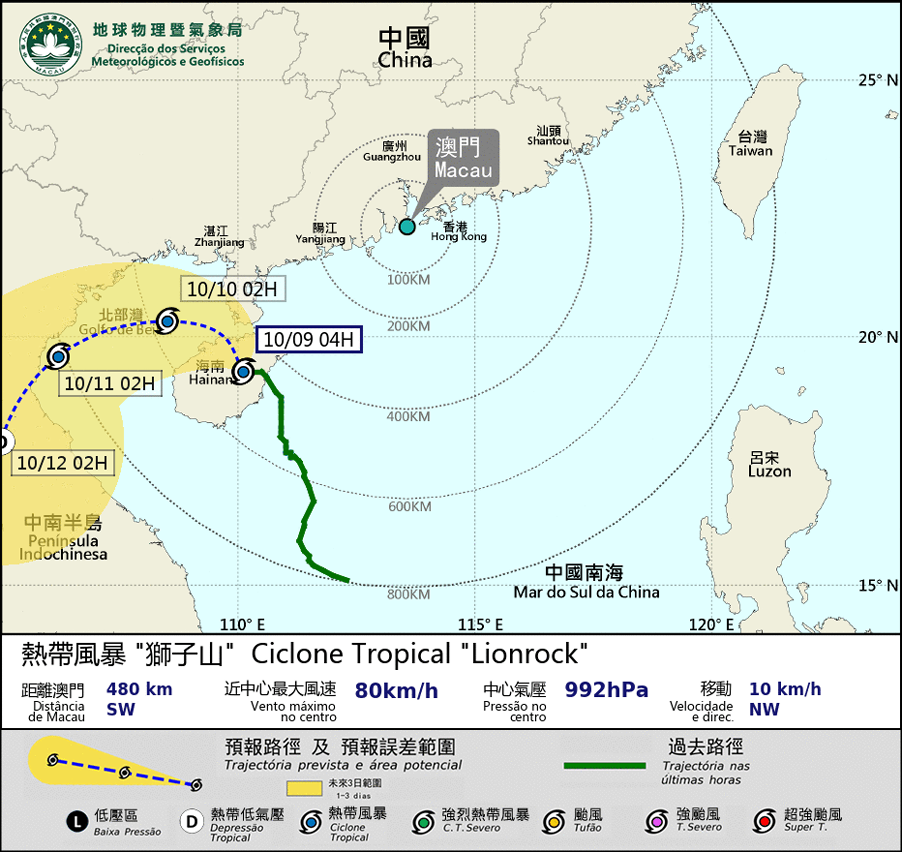 The Signal No. 3 is still in effect. Signal No. 8 Southeast will be issued at 6 am on the 9th. At 5 am in the morning, the tropical storm "Lionrock" located at about 490 kilometers southwest of Macao, approaching the Gulf of Beibu. Under the combined influence of “Lionrock” and the northeast monsoon, gale wind will occasionally affect Macao this morning. The wind force will reach 7 to 8, with frequent heavy showers and thunderstorms.