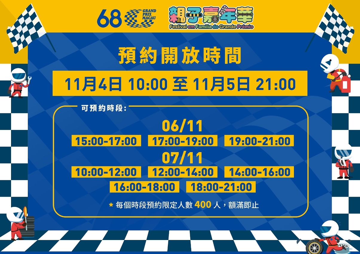 Residents and visitors who wish to register online may do so via the Macau Grand Prix Facebook page or WeChat account, by going to the "Macao Major Sporting Events Facebook Page" or the "Macao Major Sporting Events WeChat Account" and log in to the system for registration, from 10am on November 4th to 9pm on November 5th. Each time slot is limited to 400 people. In addition, a small number of places will be available on site to allow people to participate in the event.