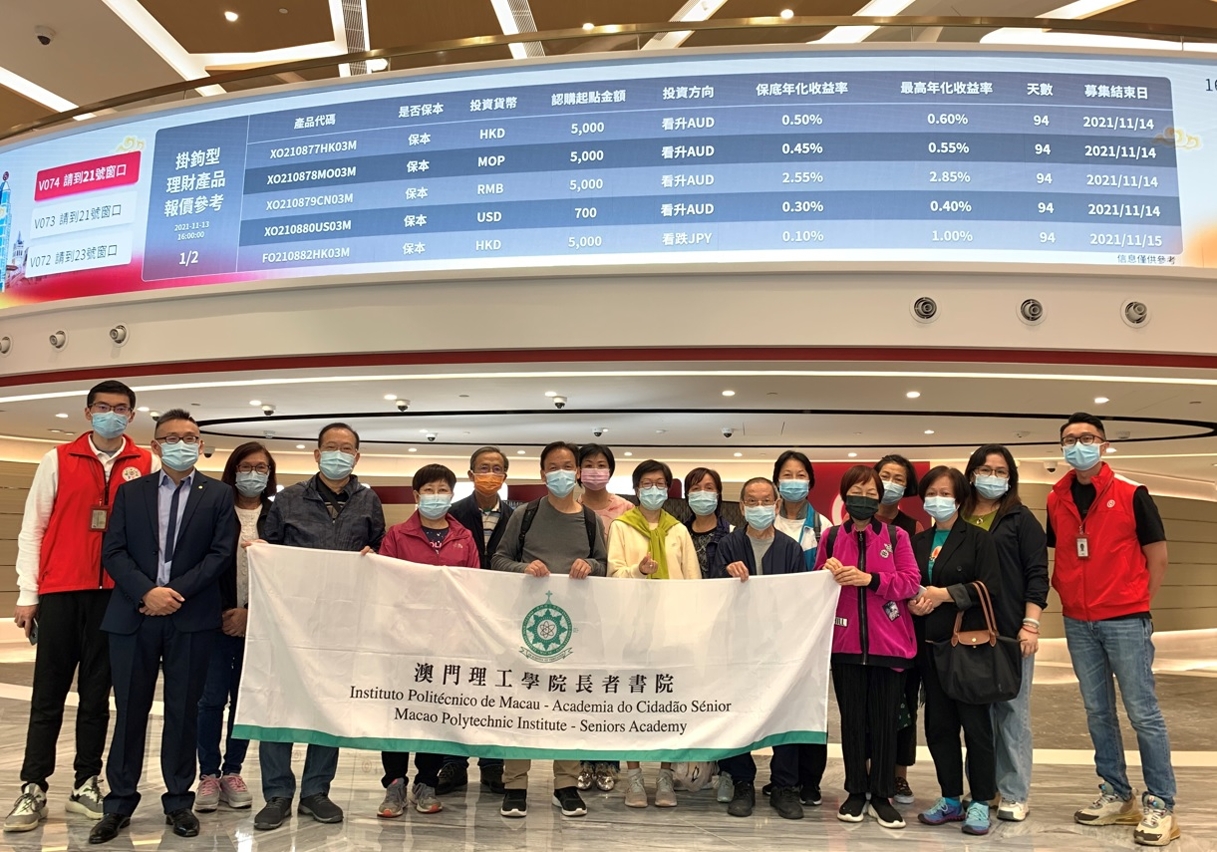 Recently, Students of the Electronic Service Application Course of the MPI Seniors Academy, led by Miss Chan Chio Lai to visit the Bank of China Macau Branch (San Ma Lou sub-branch). The ACS expects that by participating in this tour, students will gain a better understanding of various e-banking services by combining actual operation with the content of daily e-courses, as well as experience the ease that electronic technology provides.