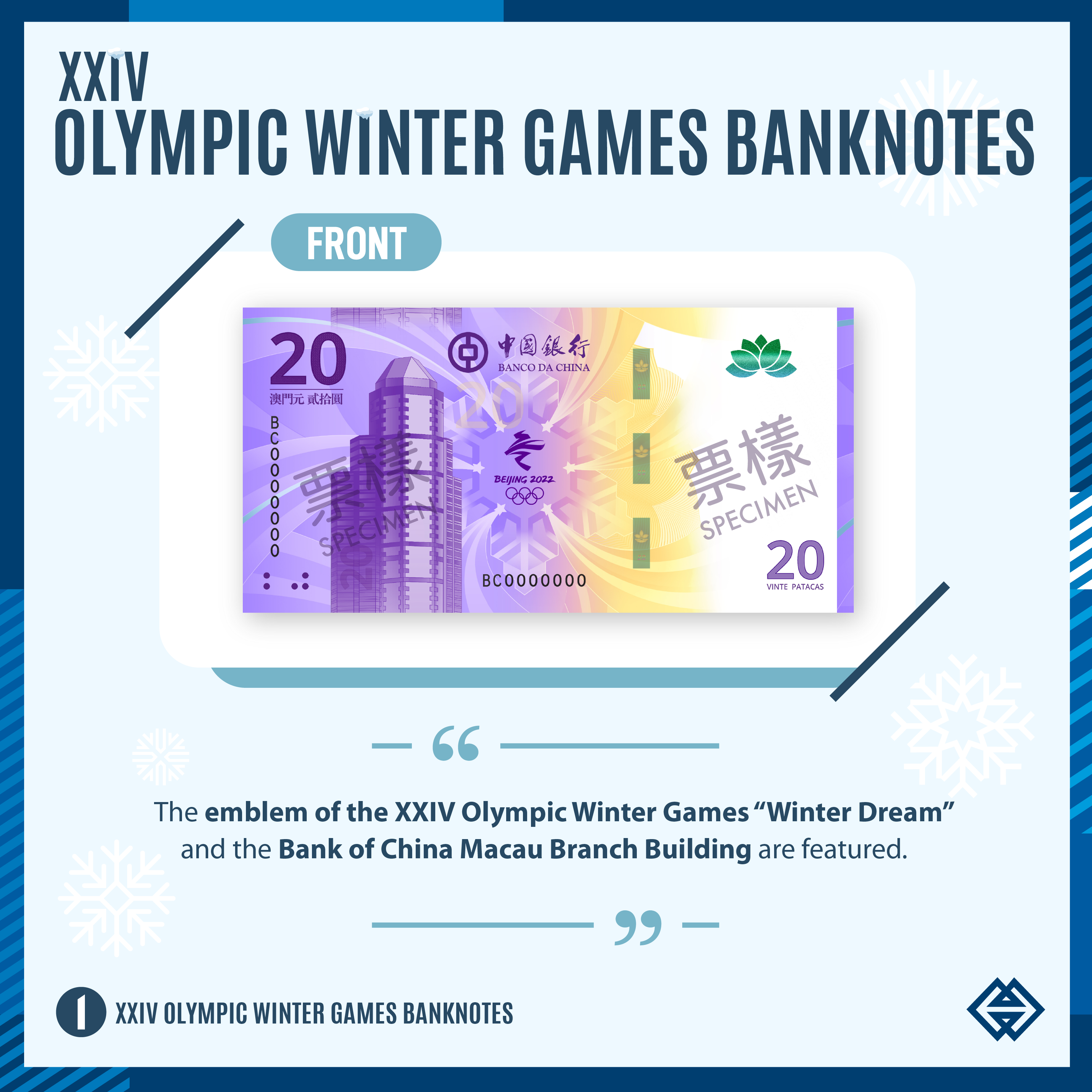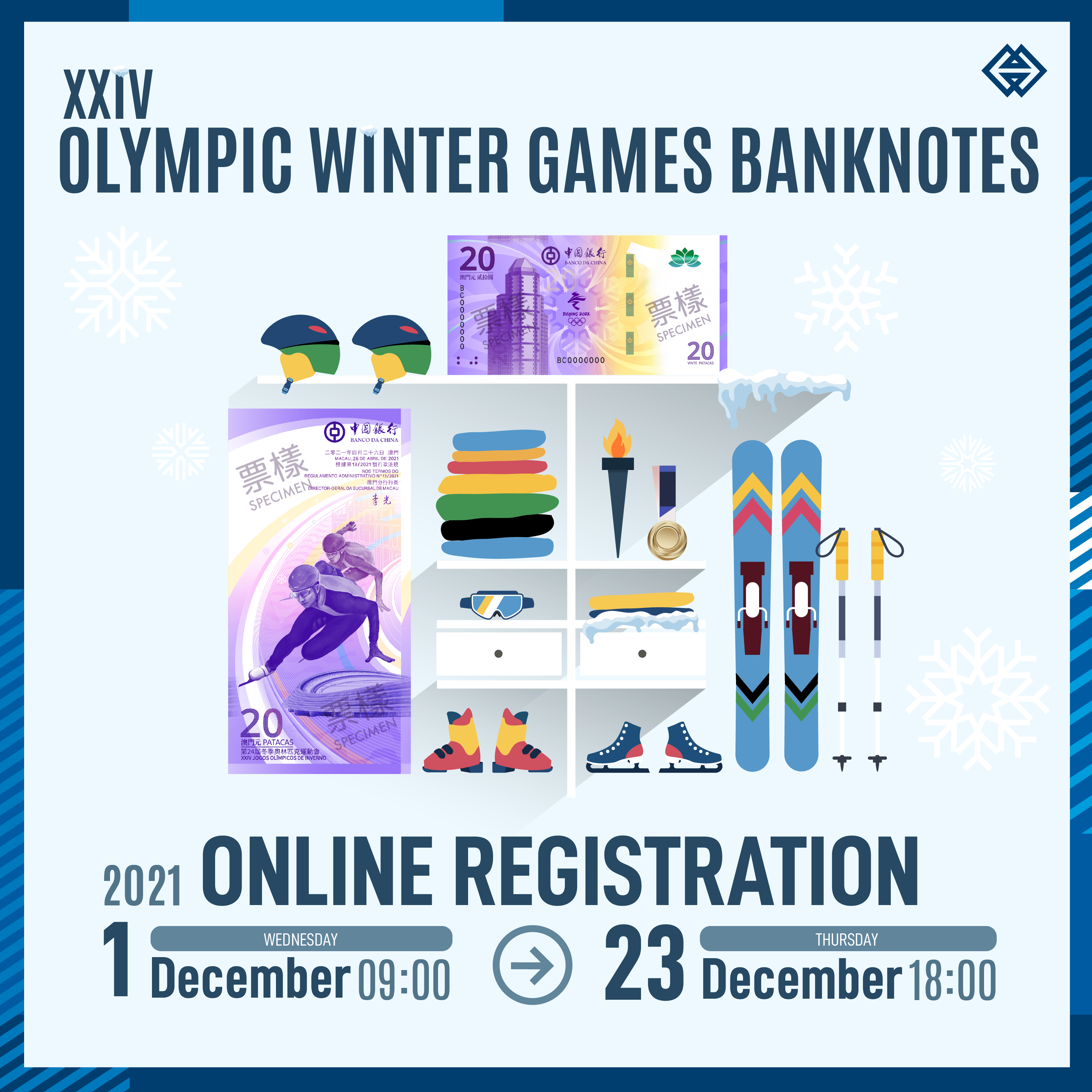 To celebrate the XXIV Olympic Winter Games which will be held in Beijing in 2022, Bank of China (BOC) has been authorized to issue the XXIV Olympic Winter Games banknotes, which will be available for registration and exchange by Macao residents commencing from December 1 (Next Wednesday).