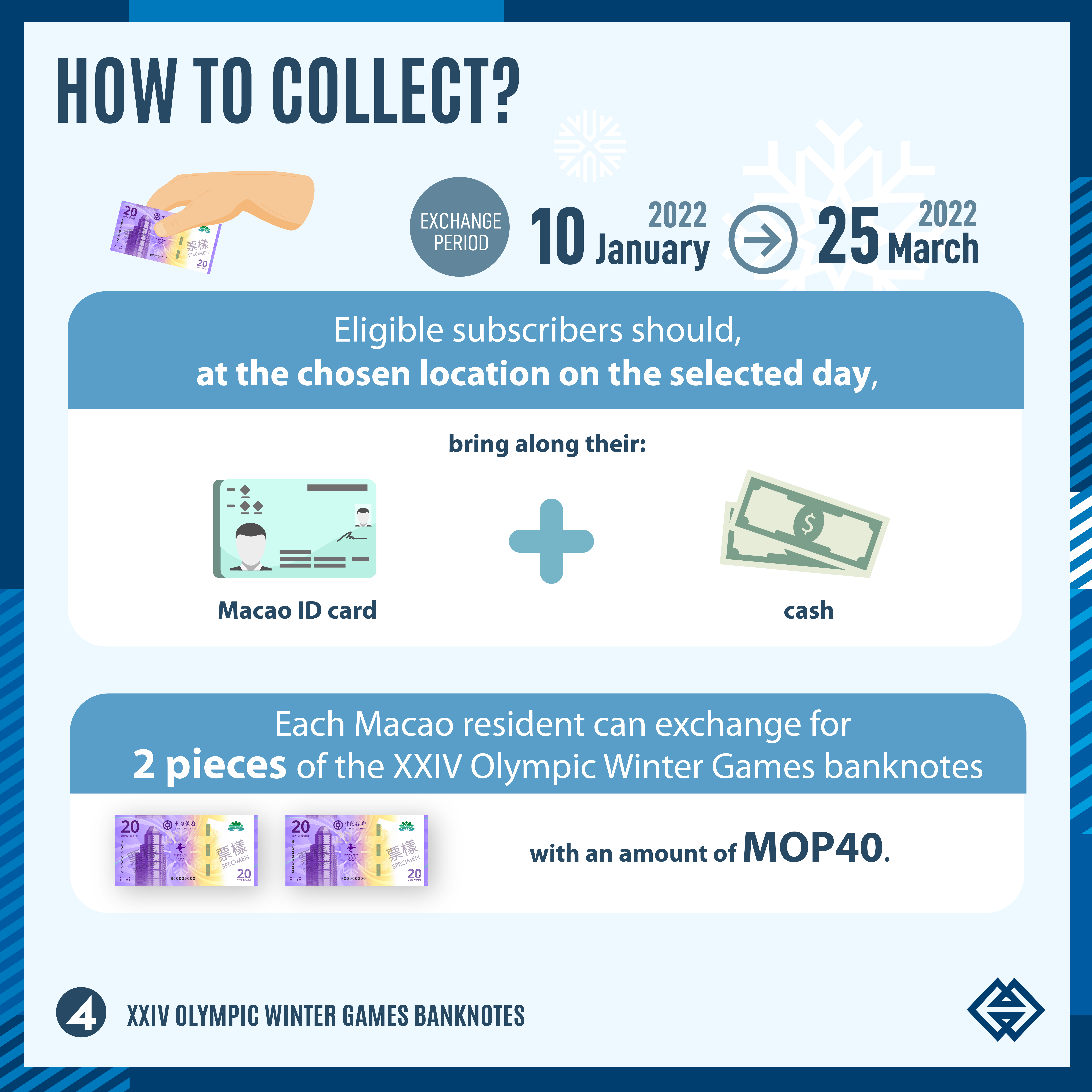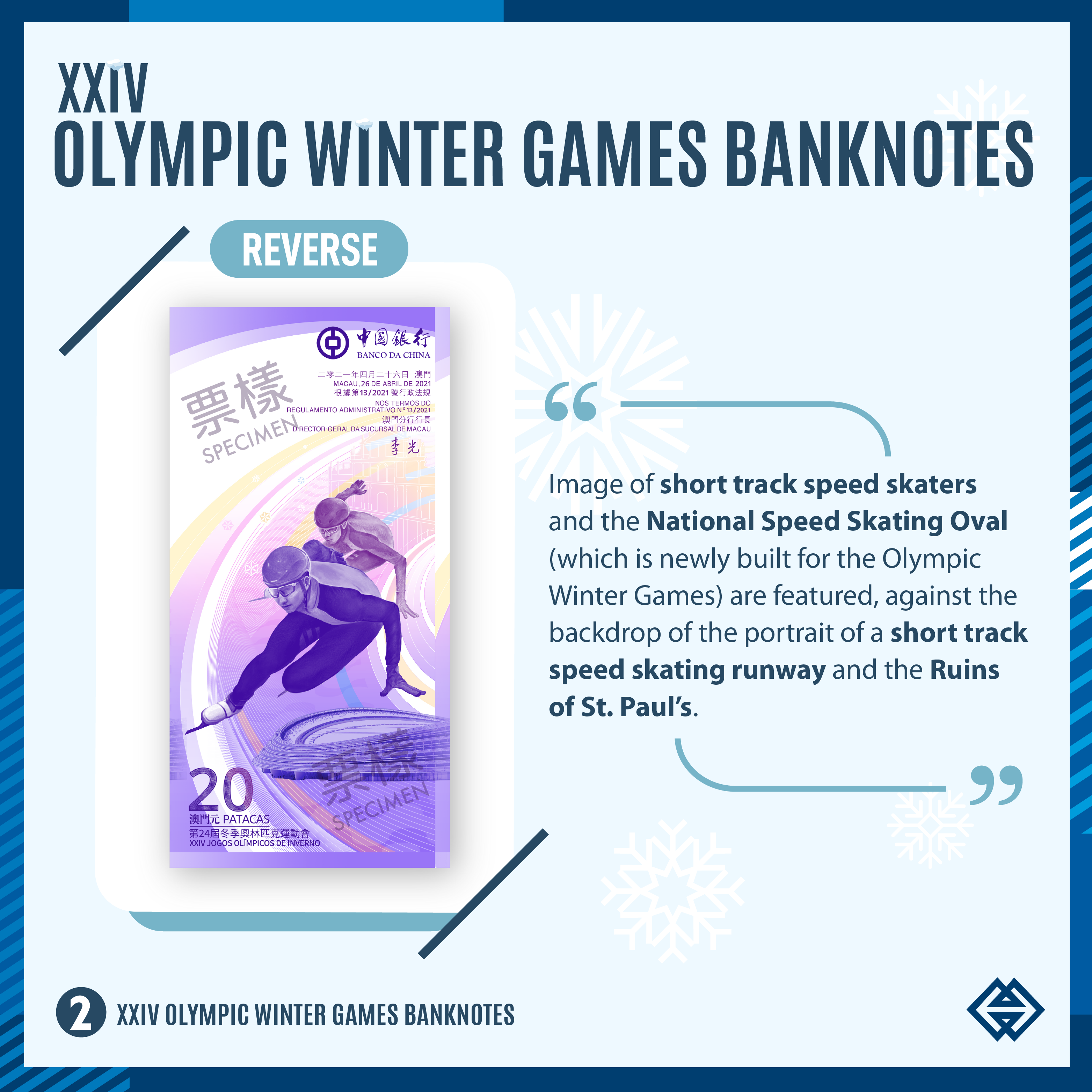 The front of the XXIV Olympic Winter Games banknotes issued by the Bank of China will feature the emblem of the XXIV Olympic Winter Games “Winter Dream” and the “Bank of China Macau Branch Building”; while the reverse features an image of short track speed skaters and the National Speed Skating Oval that has been newly built for the Olympic Winter Games, against the backdrop of the portrait of a short track speed skating runway and the Ruins of St. Paul’s. Each Macao resident can register to exchange for 2 pieces of the XXIV Olympic Winter Games banknotes with an amount of MOP40.