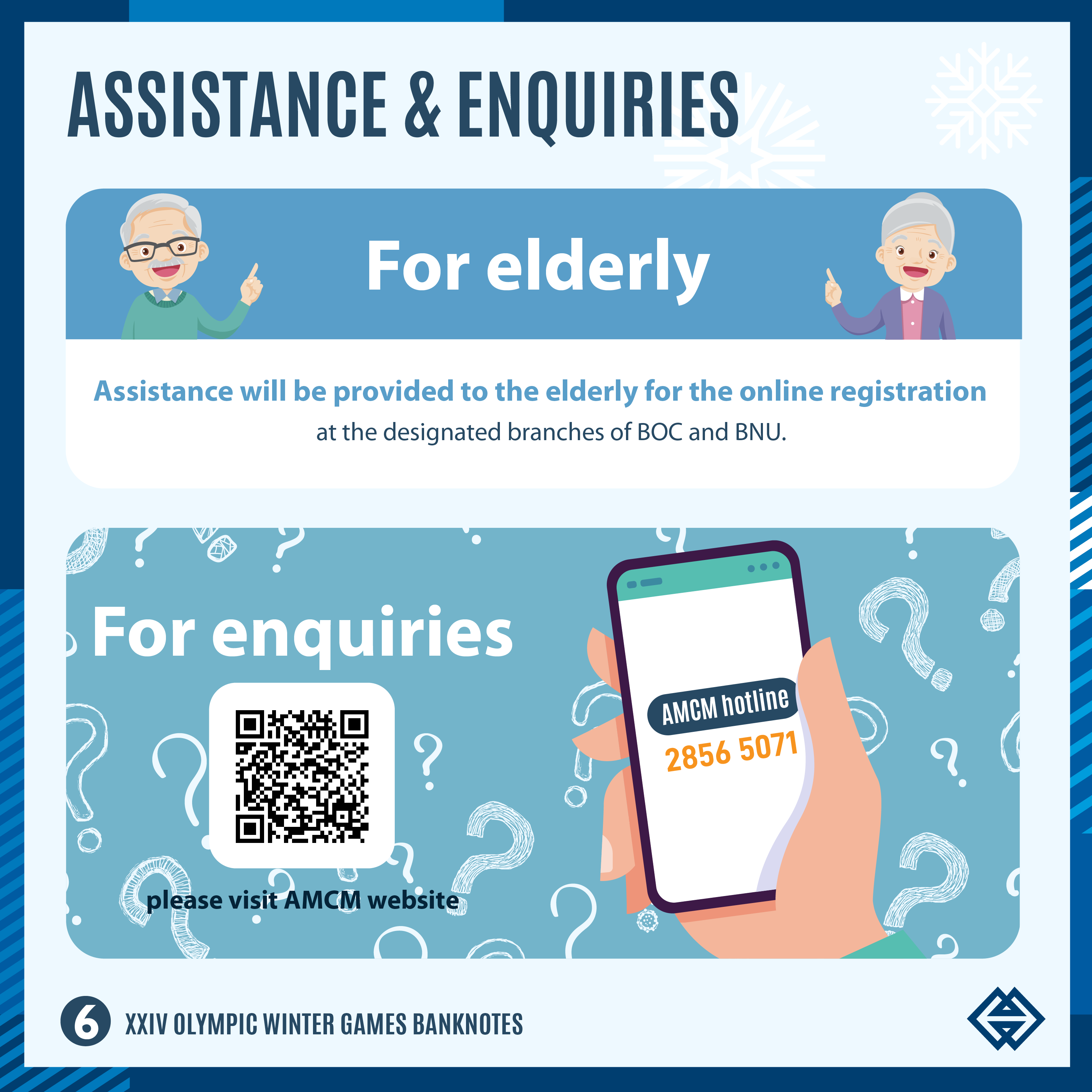 At designated branches of BOC Macao Branch and BNU, assistance will be provided to the elderly for the conduct of the online registration process. For enquiries, please call our hotline: 2856 5071, or browse our website: