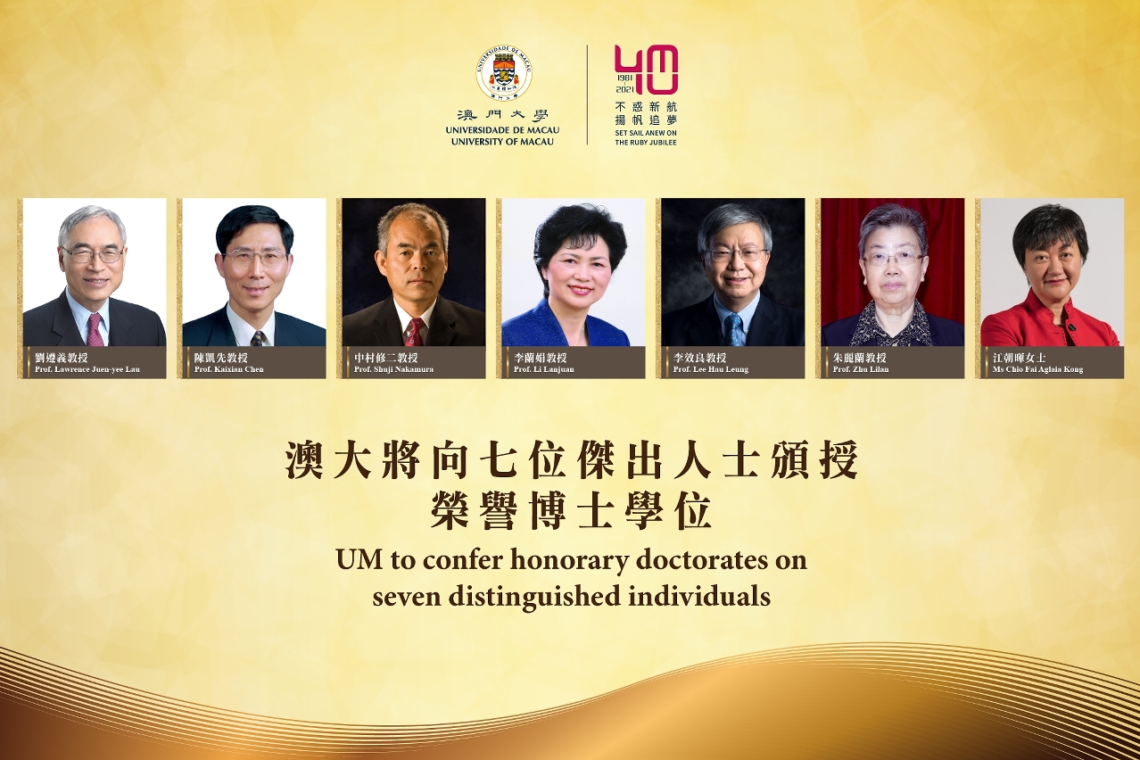 The University of Macau (UM) will confer honorary doctorates on Lawrence Juen-yee Lau, Kaixian Chen, Shuji Nakamura, Li Lanjuan, Lee Hau Leung, Zhu Lilan and Chio Fai Aglaia Kong in recognition of their outstanding achievements and significant contributions to social development and education. Some of the recipients will receive their doctorates at the Ceremony for the Conferment of Honorary and Higher Degrees 2021 to be held on 11 December (Saturday) at 4:00pm in the University Hall. In addition, PhD degrees, master’s degrees, and postgraduate certificates/diplomas will be presented at the ceremony. The ceremony will be broadcast live so that graduates and their families and friends from all over the world can participate in the event.