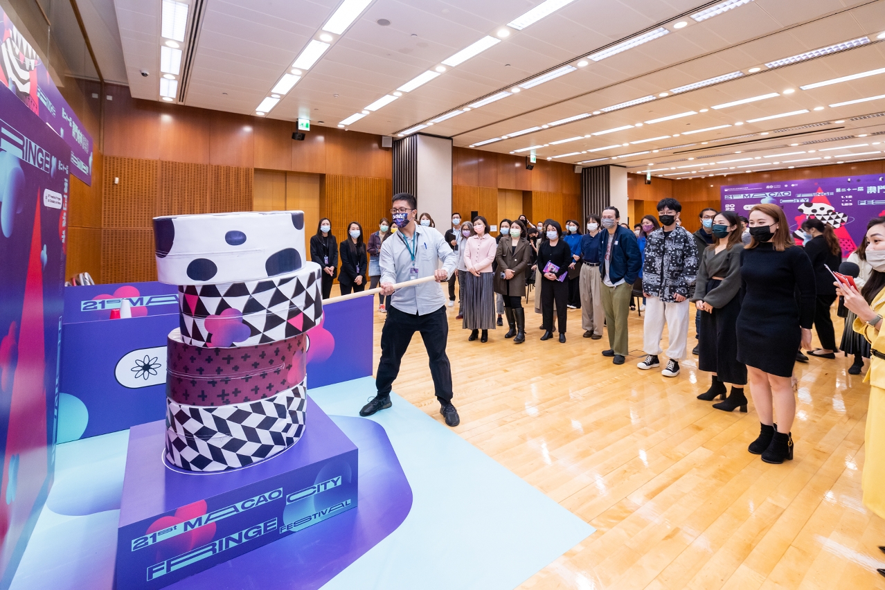 The press conference of the 21st Macao City Fringe Festival was held on 9 December, at the conference room of the Macao Cultural Centre, with the presence of the President of the Cultural Affairs Bureau, Mok Ian Ian; the Head of the Department of Performing Arts Development of the Cultural Affairs Bureau, Iu Wai Man; the Acting Head of the Division of Performing Arts of the Cultural Affairs Bureau, Tong Pui I; as well as representatives of participating art groups and art professionals. There was a game zone based on the design of main image of this year’s Fringe Festival and some of its programmes at the venue of the press conference. Games will also be available at the opening ceremony, where the public can enjoy the fun of art and recall those simple but happy memories, thus bringing art closer to the public and integrating it into their daily lives, echoing the theme of the Fringe Festival “Margin Break”.