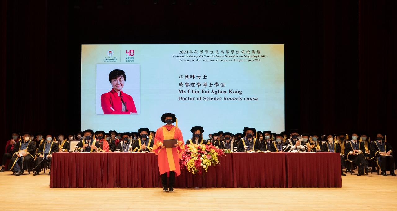 The University of Macau (UM) today (11 December) held the Ceremony for the Conferment of Honorary and Higher Degrees 2021 to confer honorary doctorates on Prof Lawrence Juen-yee Lau, Prof Kaixian Chen, Prof Shuji Nakamura, Prof Li Lanjuan, Prof Lee Hau Leung, Prof Zhu Lilan, and Ms Chio Fai Aglaia Kong in recognition of their outstanding achievements and significant contributions to social development and education.