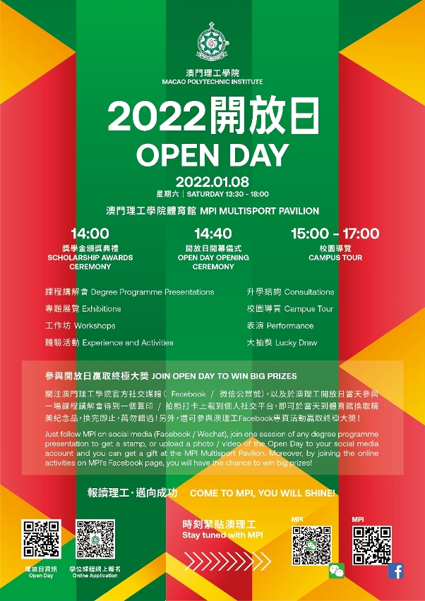 The Macao Polytechnic Institute (MPI) will hold the MPI Open Day 2022 and Scholarship Awards Ceremony on 8 January (Saturday). Featuring degree programme presentations, consultation on further studies, thematic exhibitions, campus tours, workshops, performances, and experiential activities, the event will allow the community to have a comprehensive understanding of MPI’s programmes and achievements in teaching and research, experience the exciting academic life and diverse campus culture, and share the joy of outstanding students receiving awards. Secondary school graduates, elites, parents, and interested parties are welcome to attend.