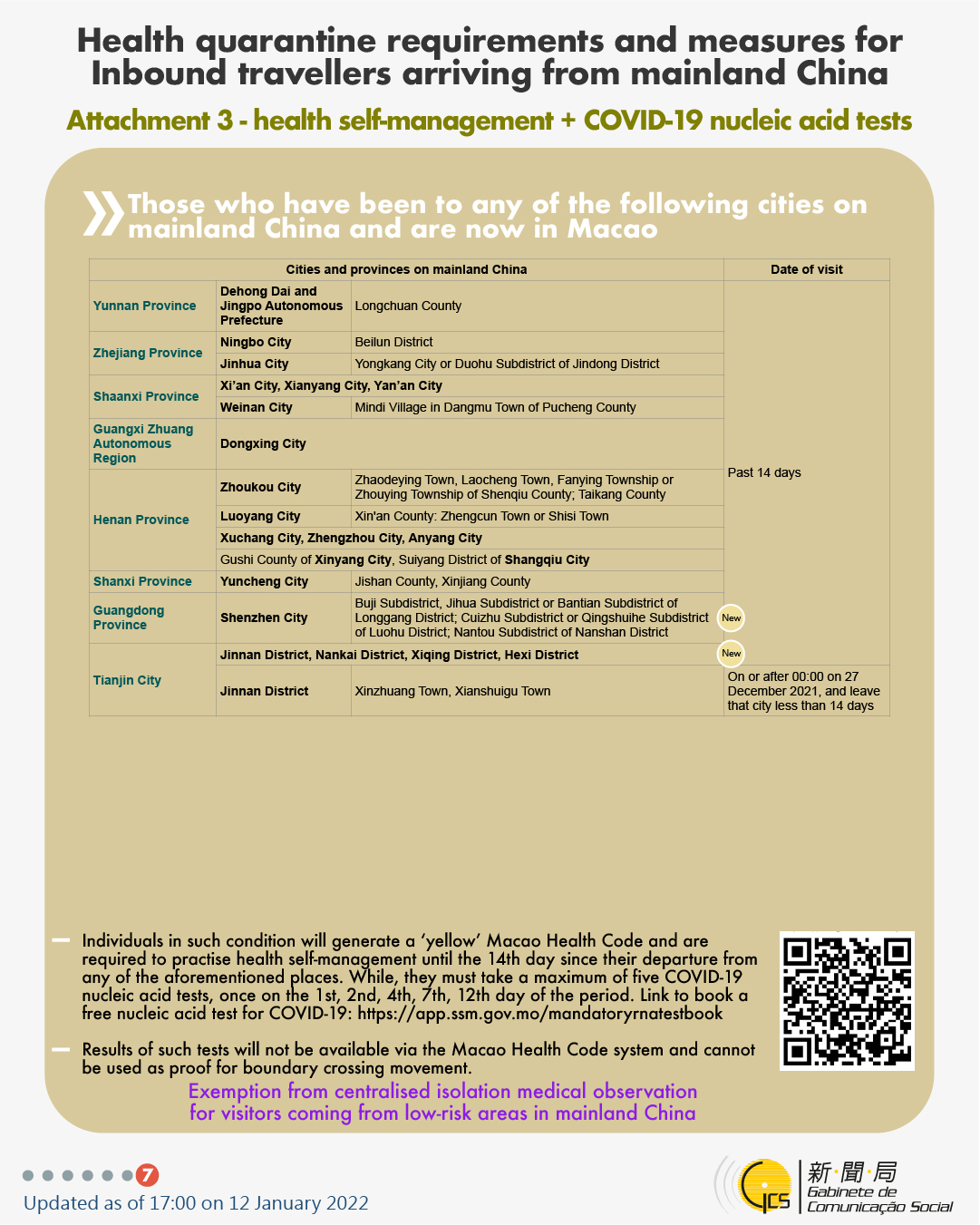 [infographic] 12 January 2022 health quarantine requirements and measures for inbound travellers of different identities.