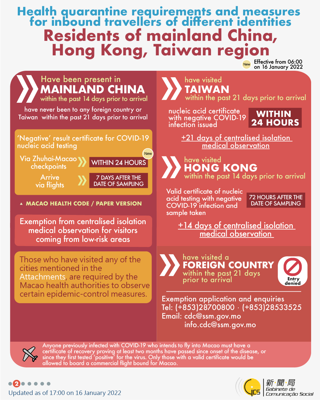 [infographic] 16 January 2022 health quarantine requirements and measures for inbound travellers of different identities.