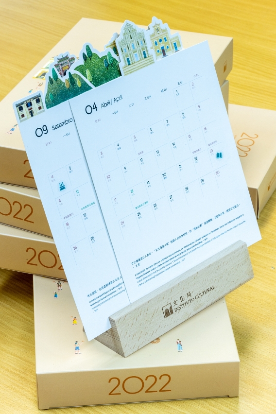 The 2022 calendar, themed “Culture is integrated with life, every minute and second”, was created by local designer Lam Ieong Kun and illustrator Una Tong, portraying how culture is integrated into the public’s daily lives. Nine writers, including Kerik Lam, Tai Pi, Ancient Ice, Meng King, Chong Chi Hou, Rai Mutsu, Tong Mui Siu, Gaaya Cheang and Tam Jian Qiao, wrote several literary pieces about cultural life and highlights quoted from these literary works are also featured in the calendar. The 2022 desk calendar of the Cultural Affairs Bureau has a distinctive design, presenting “landscape on a desk-top easel”. It is designed in a polygonal shape for the first time, featuring images of the World Heritage sites and cultural facilities at the top of each calendar page piled in layers to form a cultural landscape of Macao. This year’s desk calendar has an eco-friendly wooden stand which can be used for multi-functional purposes after the calendar year ends, such as to be a display stand or to hold other objects. The design of the desk calendar is both beautiful, creative and practical, aiming at achieving the sustainable development of cultural products.