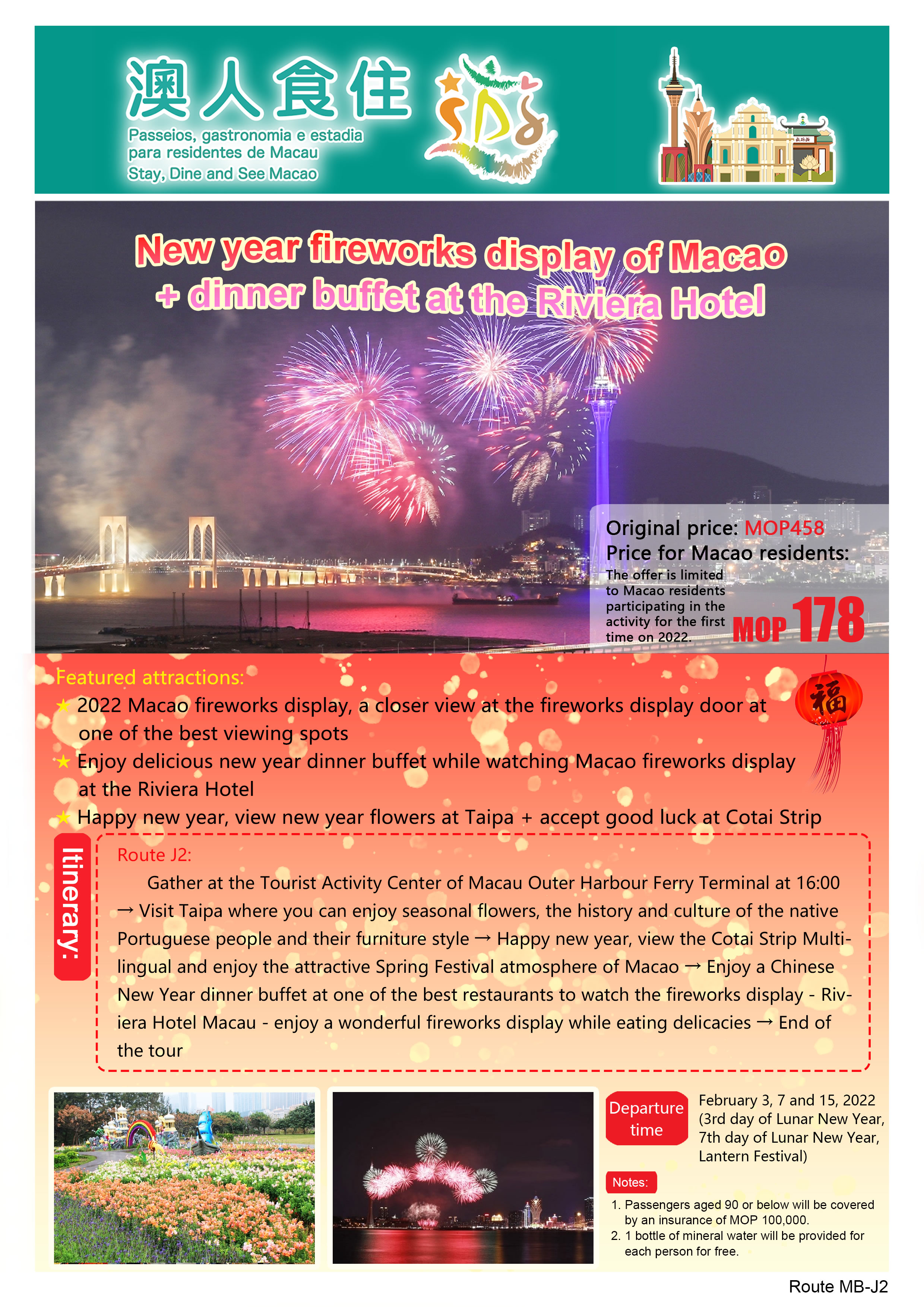 Enjoy fireworks on cruise – participants can have buffet dinner on Macau Cruise while enjoying fireworks in a close distance for the captivating impact. They can also enjoy the sight of festive-seasonal flowers at the Taipa Houses, one of Macao’s eight scenic spots, and learn more about Macanese culture at the Taipa Houses Museum.