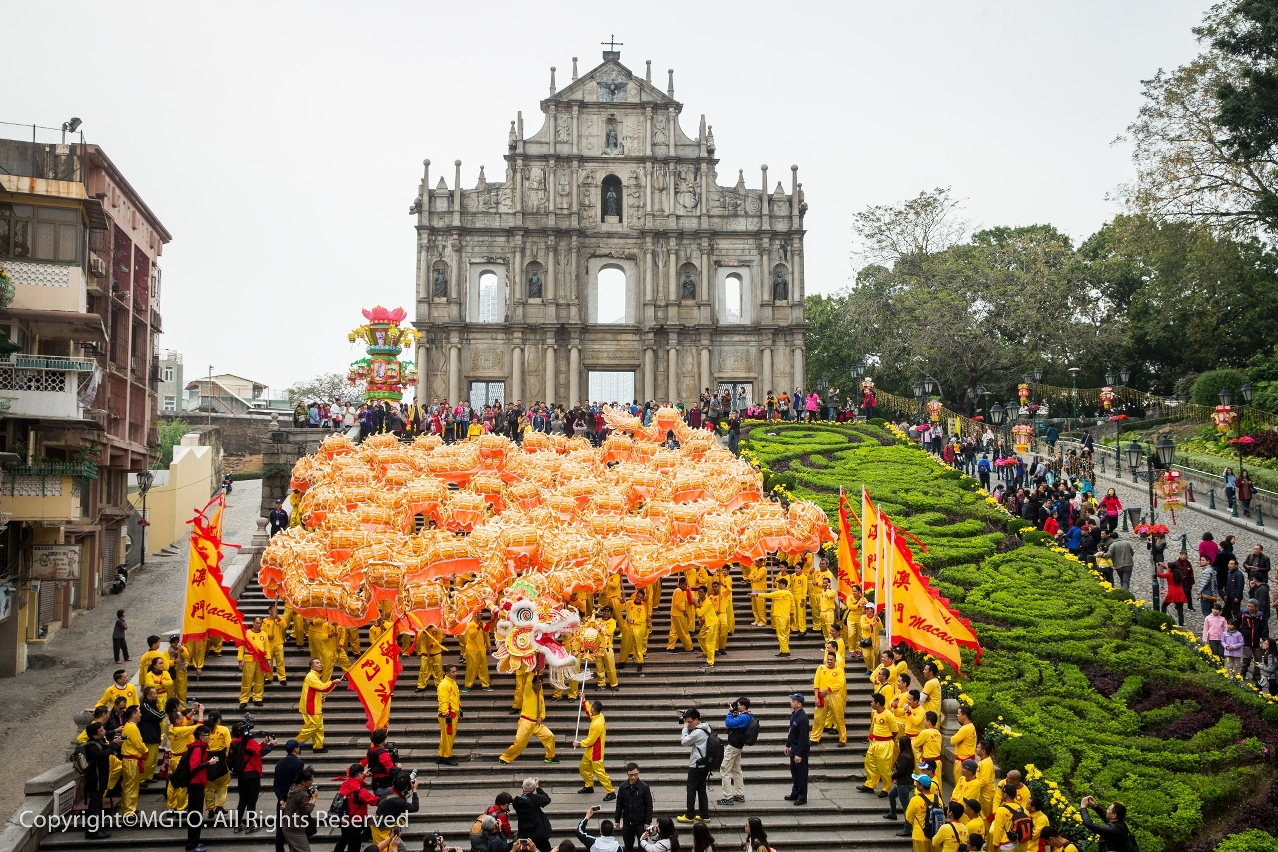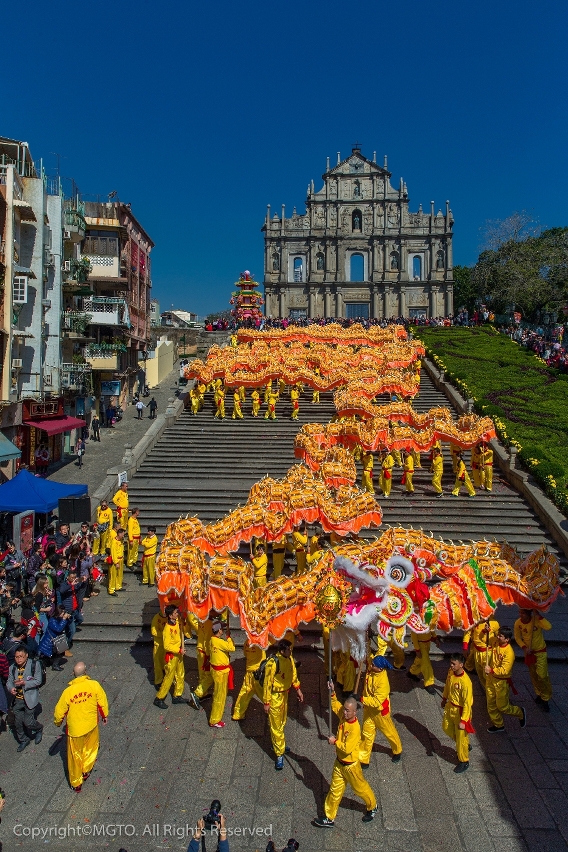 A kick-off ceremony will lift curtains upon the Golden Dragon Parade at the Ruins of St. Paul’s on the 1st day of Lunar New Year (1 February). At 10:30 a.m., the God of Fortune will distribute golden ingots as symbols of happiness and riches. At 11:00 a.m., officials of MGTO, Municipal Affairs Bureau and Cultural Affairs Bureau will officiate the eye-dotting ceremony for the golden dragon and dancing lions. The 238-meter-long golden dragon, joined by 18 dancing lions, will undulate along the route covering: Ruins of St. Paul’s, Senado Square, Calçada do Tronco Velho, St. Augustine’s Square, Rua Central, Travessa do Paiva, Sede do Governo, Travessa do Padre Narciso, St. Lawrence’s Church, Lilau Square, Rua da Barra, A-Ma Temple, Avenida Panorâmica do Lago Sai Van, roundabout at Nam Van Lake and Sai Van Lake Square, to pass on festive blessings to all residents and visitors in Macao.