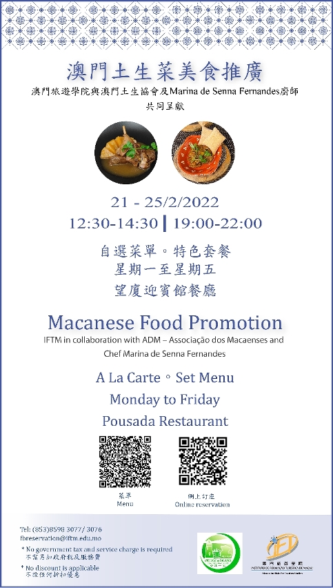 A Macanese Food Promotion will be hosted jointly by the Macao Institute for Tourism Studies (IFTM) and the Associação dos Macaenses (ADM) from 21 to 25 February 2022 to promote Macao’s gastronomic culture. The IFTM Educational Restaurant will, in collaboration with ADM and Ms. Marina de Senna Fernandes, present nearly 20 classic Macanese dishes to promote the region’s unique Macanese gastronomy. In 2021, IFTM was appointed as the protection unit for national intangible cultural heritage linked to Macanese Gastronomy. To this end, the Institute offered Macanese gastronomy cooking courses. IFTM has also launched a web version of the Macanese Cuisine Database in collaboration with the Macao Government Tourism Office, the Cultural Affairs Bureau, the International Institute of Macau, and other organisations. Additionally, the Institute set up a dedicated space for Macanese cuisine data in its library, which is home to a variety of classic recipes, manuscripts, Macanese culinary books, and publications.