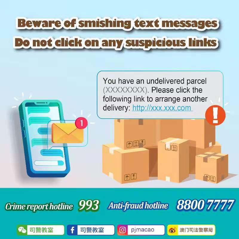 Members of the public informed the Judiciary Police regarding SMSs from fake courier companies. They were told to log in to the website provided in the SMS, key in their personal information and pay an additional fee as their parcel deliveries were unsuccessful due to disruptions caused by the epidemic.