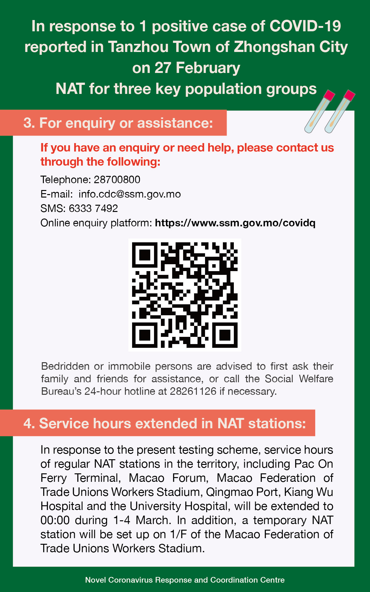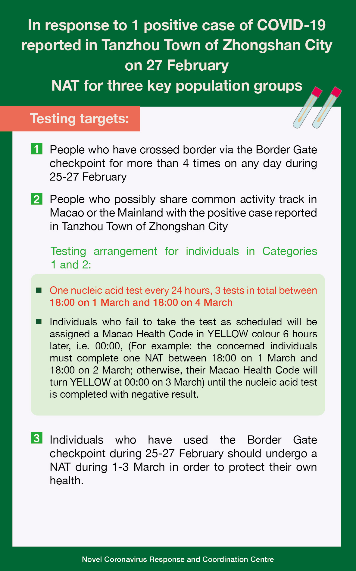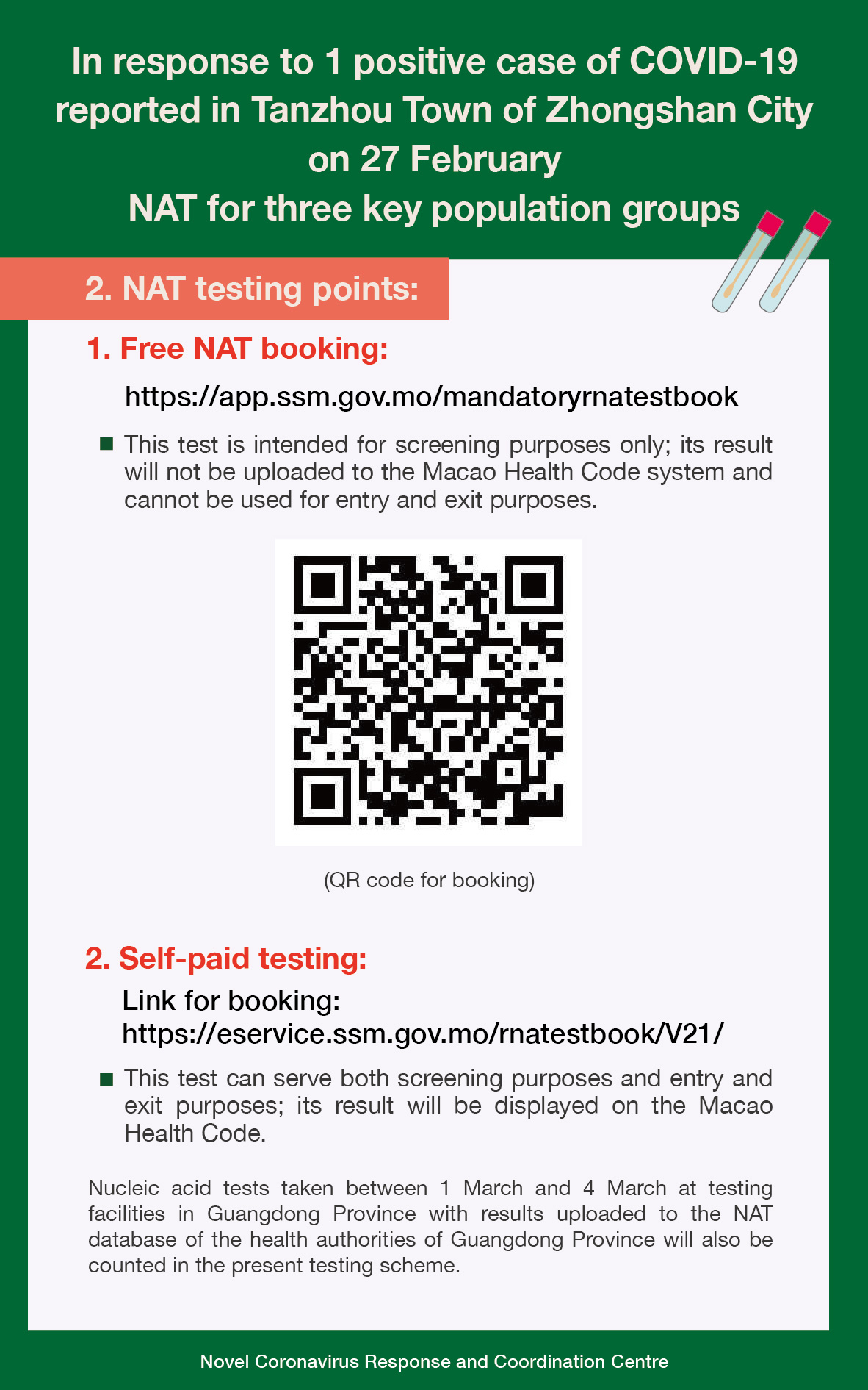In response to 1 positive case of COVID-19 reported in Tanzhou Town of Zhongshan City on 27 February NAT for three key population groups (Infographic)