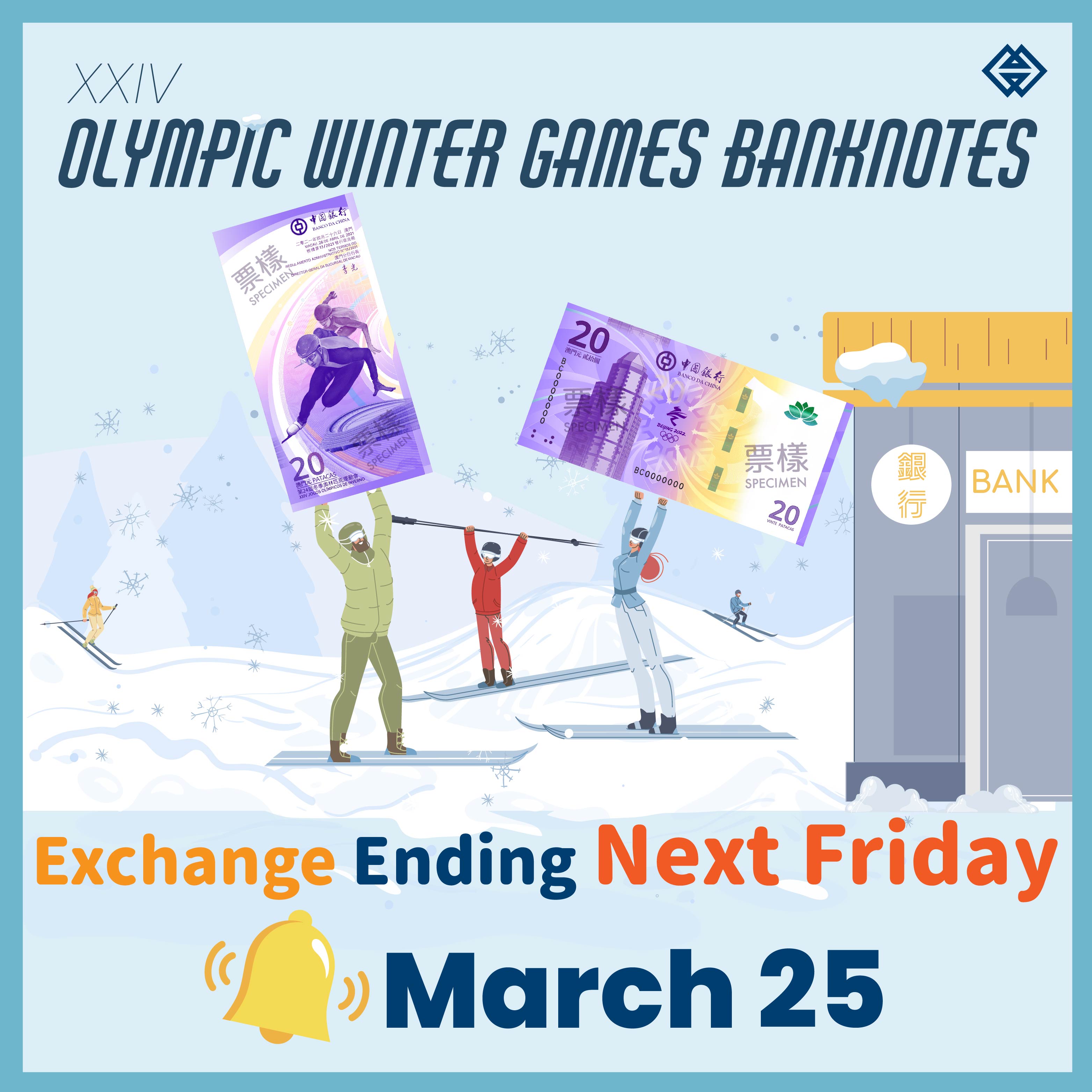 As scheduled, the exchange period for the XXIV Olympic Winter Games banknotes will end on 25 March 2022 (Friday). The Monetary Authority of Macao would like to remind those registrants who have not yet conducted the note exchange to exchange for their subscribed notes at their previously selected bank during the remaining exchange period.