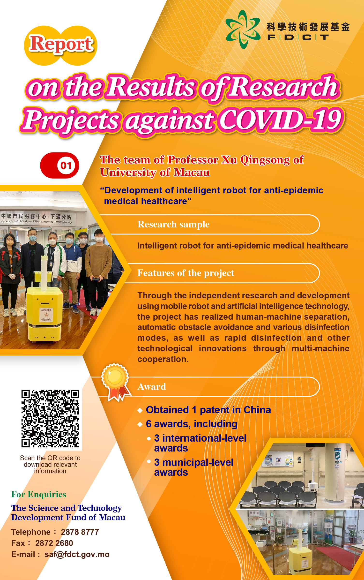 - The “Intelligent robot for anti-epidemic medical healthcare” developed by the team of Professor Xu Qingsong of University of Macau(UM) through mobile robots and artificial intelligence technology has realized human-machine separation, obstacle avoidance functions, various disinfection modes, as well as rapid and regular all-round disinfection and other technological innovations through multi-machine cooperation. The disinfection robots have been provided free of charge to various government departments including the Municipal Affairs Bureau (IAM), and used at trial sites such as the Kiang Wu Hospital and hotels. At present, many enterprises intend to realize the implementation and mass production of disinfection robots, which will help facilitate the industrialization level of Macao and the Guangdong-Hong Kong-Macao Greater Bay Area in related fields. In addition, the project has also granted 1 patent in China and received 6 awards, of which 3 are international and 3 are municipal.