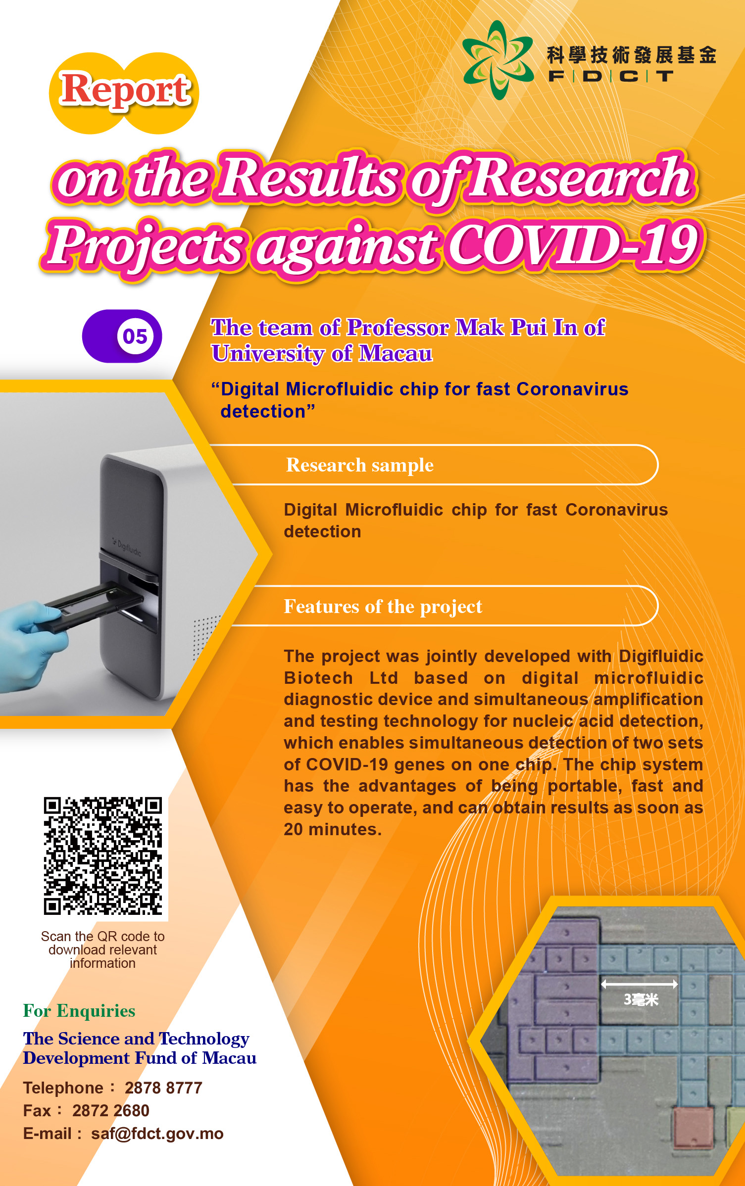 V. The project of “Digital Microfluidic chip for fast Coronavirus detection” by Professor Mak Pui In of UM was jointly developed with Digifluidic Biotech Ltd. Based on digital microfluidic technology and simultaneous amplification and testing technology for nucleic acid detection, the project enables simultaneous detection of two sets of COVID-19 genes on one chip, and the results can be obtained as soon as 20 minutes after the virus specimen is collected. The chip system has the advantages of being portable, fast and easy to operate.