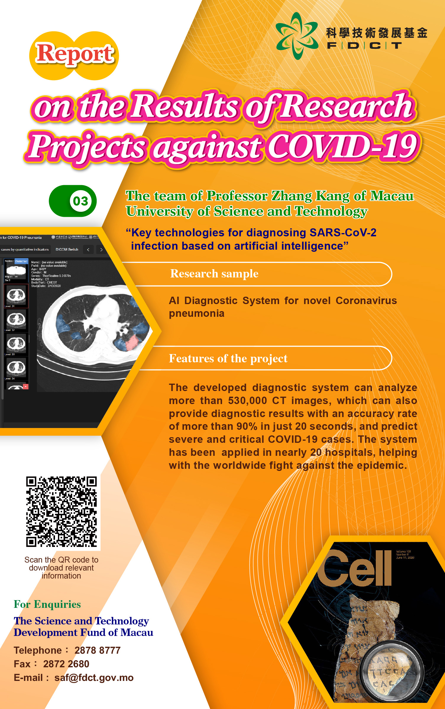III. The “Key techniques for diagnosing new coronavirus SARS-CoV-2 infection based on artificial intelligence” was developed by the team of Professor Zhang Kang of Macau University of Science and Technology (MUST), which uses machine deep learning to analyze more than 530,000 CT images for the first time to develop the diagnostic system. The techniques can also provide diagnostic results with an accuracy rate of more than 90% in just 20 seconds, and predict severe and critical COVID-19 cases. The results were not only published in the world’s top magazine Cell, but also applied in nearly 20 hospitals in Macau, Guangzhou, Wuhan and other cities. In addition, they were deployed to Europe, the US, South Korea, Brazil, Ecuador and other countries and regions through the cloud platform to help with the worldwide fight against the epidemic.