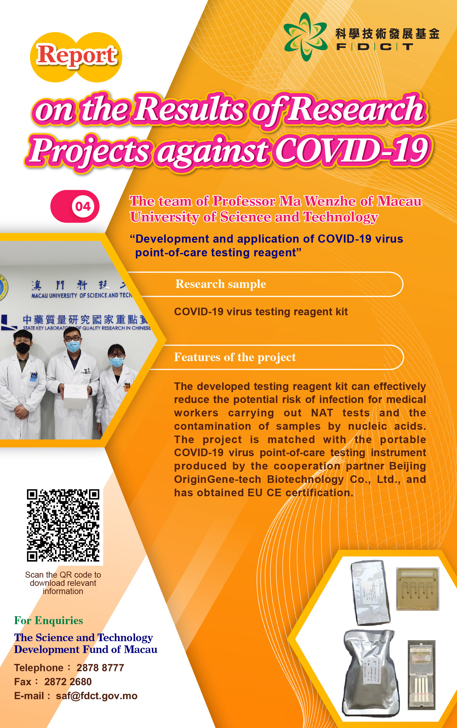 IV. The team of Professor Ma Wenzhe of Macau University of Science and Technology (MUST), through the project of “Development and application of COVID-19 virus point-of-care testing reagent”, has developed testing reagent kits that realize the integration of virus specimen collection and inactivation and nucleic acid extraction, effectively eliminating the potential infection risks of “cover opening” for medical workers carrying out NAT tests and the contamination of samples by nucleic acids in the environment. The testing reagent kits are matched with the portable COVID-19 virus point-of-care testing instrument produced by the cooperation partner Beijing OriginGene-tech Biotechnology Co., Ltd., which lower the requirements for medical workers carrying out NAT tests and break through the limitation that NAT test must be carried out in the laboratory, and can be applied in various scenarios. The kits have obtained EU CE certification and are currently being tested in many countries in Europe, Southeast Asia, the Middle East, and Africa.