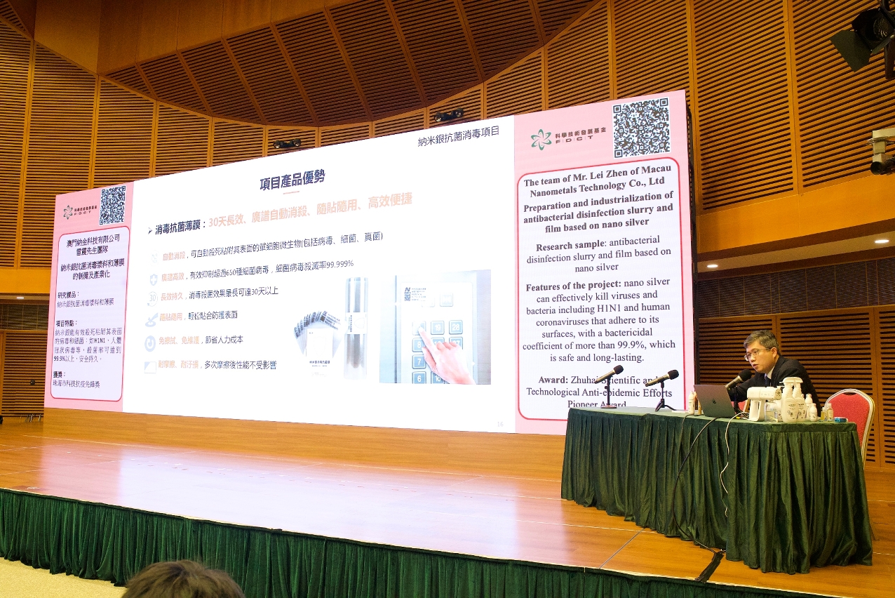 II. The team of Mr. Lei Zhen from Macau Nanometals Technology Co., Ltd has developed nano-silver disinfection products through the project of “Preparation and industrialization of antibacterial disinfection slurry and film based on nano silver”, which can effectively inhibit more than 650 kinds of unicellular organisms such as the Staphylococcus aureus and the Escherichia coli, and kill viruses and bacteria that adhere to their surfaces. The products are effective in inhibiting and killing Influenza A virus subtype H1N1 and human coronaviruses. The sterilization effect of the antibviral film is still over 99.9% after being soaked in water for 30 days and rubbed violently for 2,000 times. The products have been tested and proofed to be safe, non-irritating and long-lasting, and have also been granted the Zhuhai Scientific and Technological Anti-epidemic Efforts Pioneer Award.