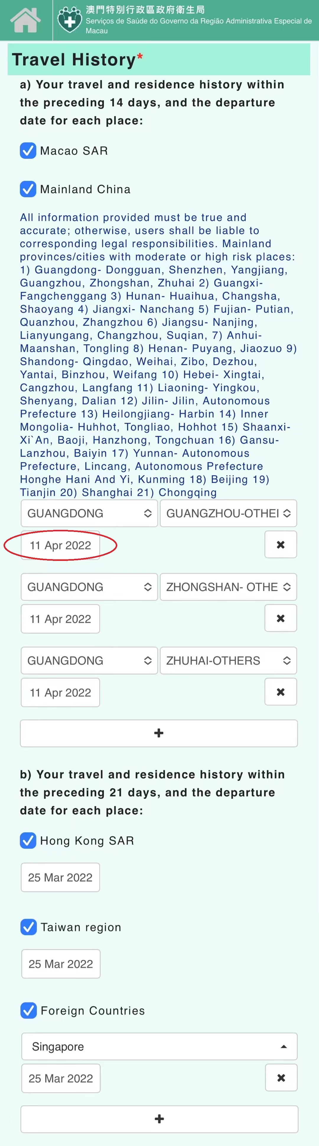 - It was necessary to remember to revise the travel or residence history; after returning to Macao and completing the declaration in travel or residence history, the concerned individuals would forget to revise the content and lead to wrong declarations that affected the correct colour displaying on the Macao Health Code;