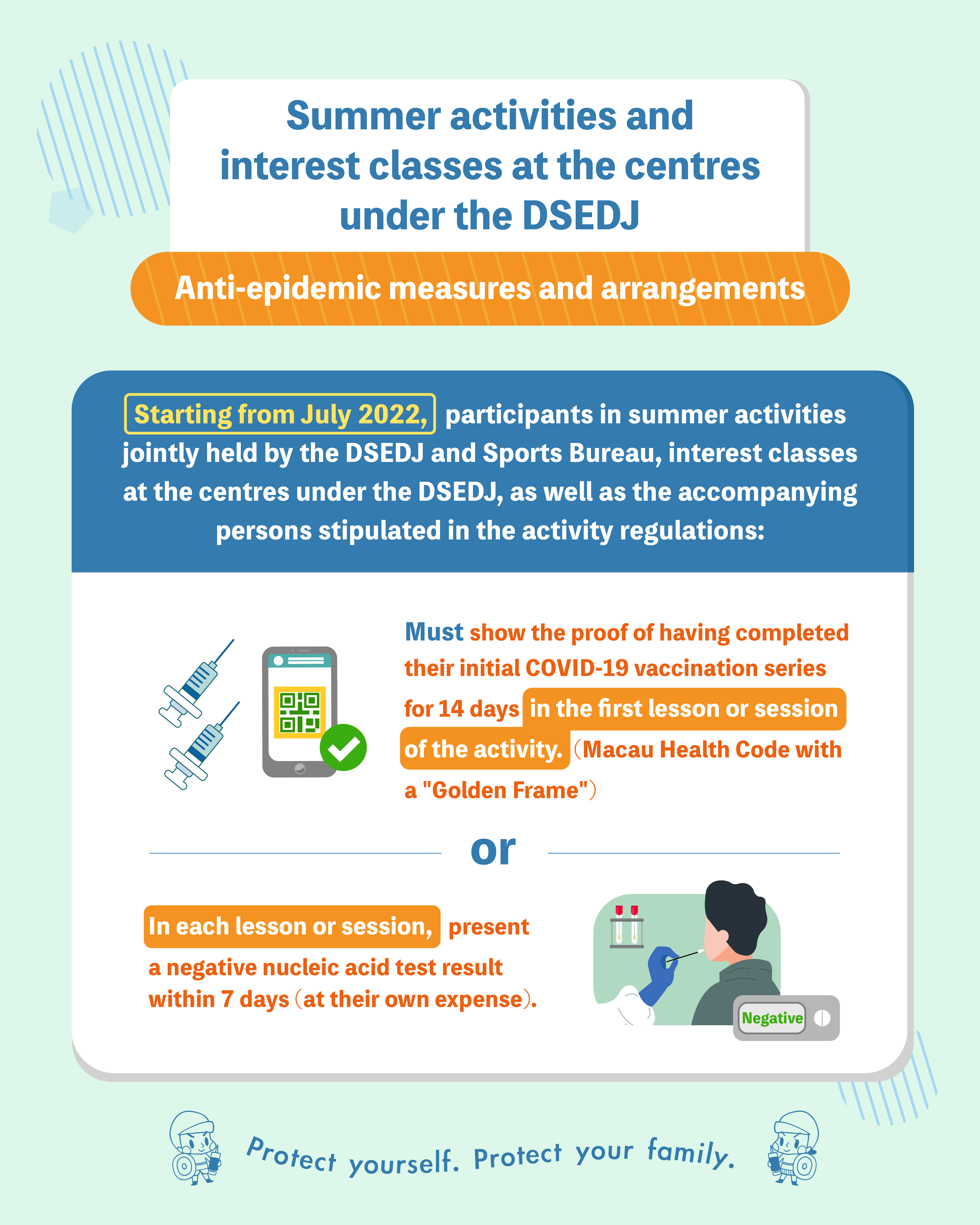 In response to the needs of epidemic prevention and control, and taking into account the changes in the epidemic situation in neighboring regions, the Education and Youth Development Bureau (the DSEDJ), on the premise of safeguarding the health of teachers and students, has communicated with some school leaders and groups in Macau. It is announced that starting from July 2022, participants in summer activities jointly held by the DSEDJ and Sports Bureau, interest classes at the centres under the DSEDJ, as well as the accompanying persons stipulated in the activity regulations must show a proof of having completed their initial COVID-19 vaccination series for 14 days (Macau Health Code with a "Golden Frame") in the first lesson or session of the activity, or present a negative nucleic acid test result within 7 days in each lesson or session (at their own expense).