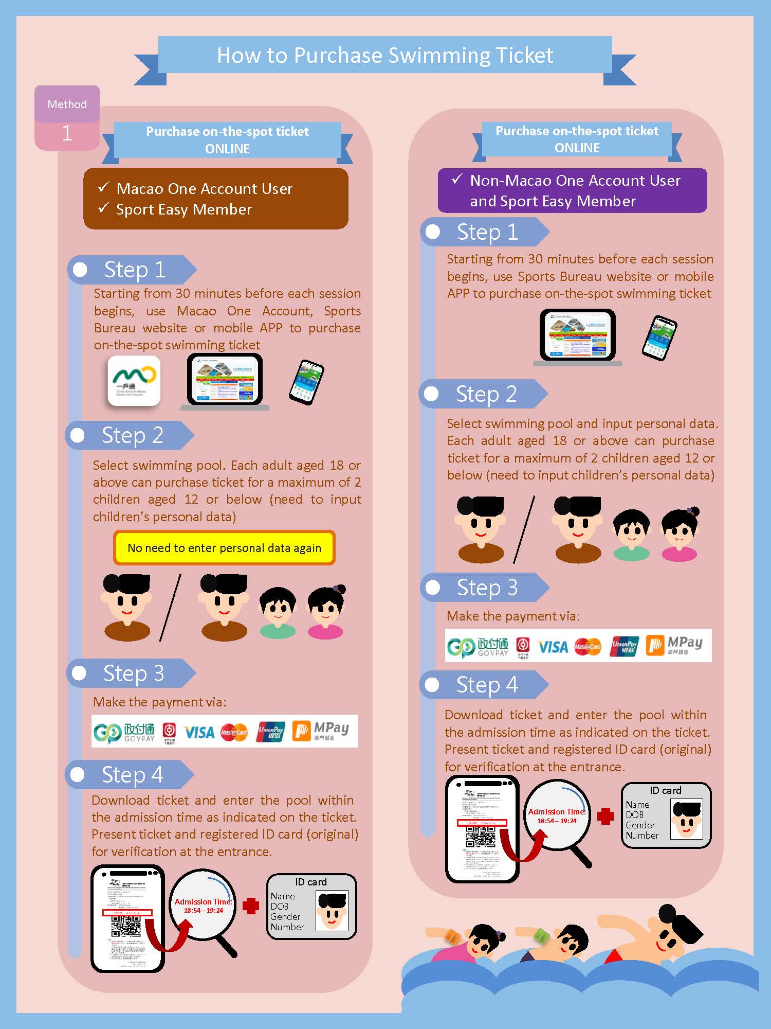 To facilitate the purchase of on-the-spot swimming ticket, with effect from 1 May, ID issues online ticketing service of on-the-spot swimming ticket. Users can purchase on-the-spot swimming ticket 30 minutes before each swimming session begins through the following three channels: “Macao One Account”, ID website and ID mobile APP, shortening their waiting time at the venue. As children aged 12 or below are required to be accompanied by adult aged 18 or above when purchasing ticket and swimming, each adult can add information of a maximum of two children in the online ticketing system.