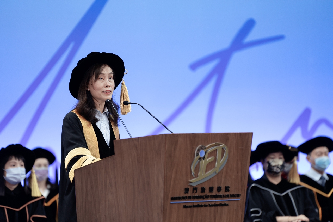 The representative of the Chief Executive Officer of the Macao SAR - Ms. Ao Ieong U, Secretary for Social Affairs and Culture - presided over the ceremony, accompanied by Mr. Chan Chak Mo, Chair of the IFTM Council, and Dr. Fanny Vong Chuk Kwan, President of IFTM. The ceremony was also attended by representatives from the Liaison Office of the Central People's Government in the Macao SAR, Office of the Commissioner of the Ministry of Foreign Affairs of the PRC in the Macao SAR, members of the IFTM Council, members of the Legislative Assembly, government officials, schools representatives, scholarship and fellowship institutions, representatives from tourism and service industries, who shared the joy of graduates and witnessed the solemn and wonderful moments.