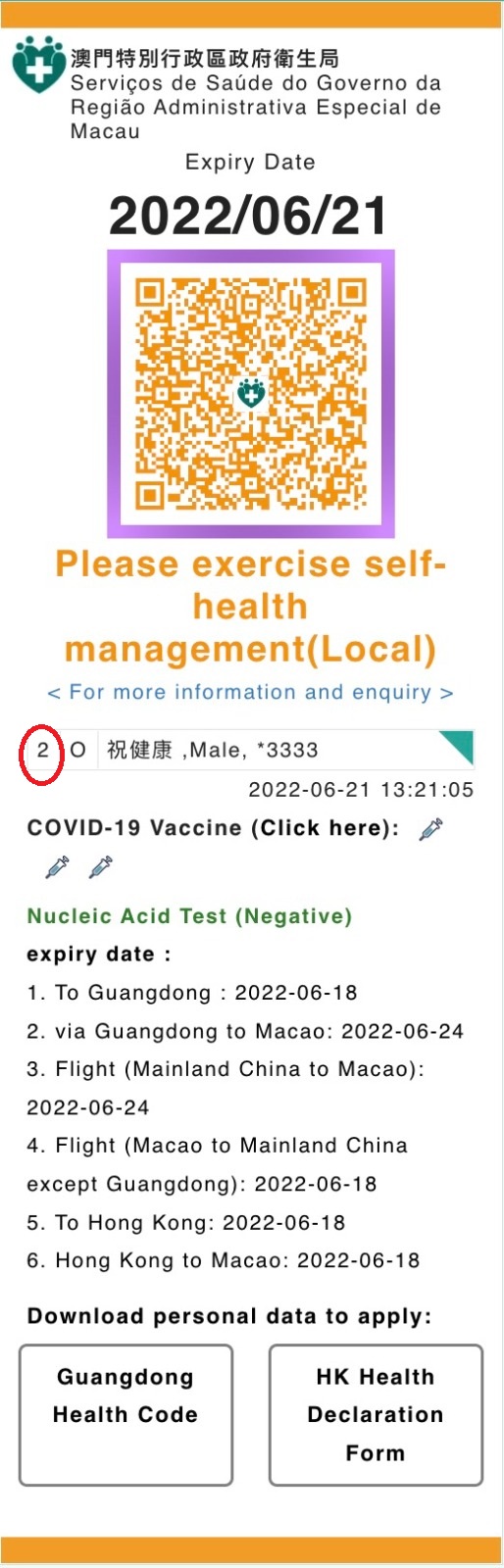 Example: A resident's health code was set to a yellow code (code 2) due to a risky travel history on 1 July. The yellow code period is from 1 July to 4 July, during which two nucleic acid tests are required on different dates. Residents make an appointment for the testing by themselves, and the yellow code (code 2) will be lifted on 5 July after two negative nucleic acid testing results were obtained. For details, please refer to “Epidemic Prevention Requirements for Individuals with at-risk Itineraries in Macao Health Code Visit Records” (https://www.ssm.gov.mo/docs/22667/22667_e541add8ca32407abd397b89c83108d6_000_.pdf) on Special Webpage Against Epidemics.