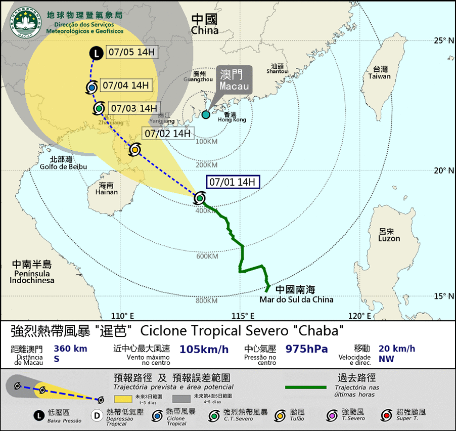 Severe tropical storm “Chaba” is expected to move northwest and generally towards the western coast of Guangdong. It will move closest to Macao between this evening (1st) and tomorrow morning (2nd). As “Chaba” is gradually intensifying, which may further develop into a typhoon, and “Chaba” may take a more northerly path approaching Macao, the wind force in Macao may reach the lower bound of the wind force of typhoon signal No. 8. SMG will consider issuing typhoon signal No. 8 between nighttime and midnight depending on the development of “Chaba” and changes in the local wind.