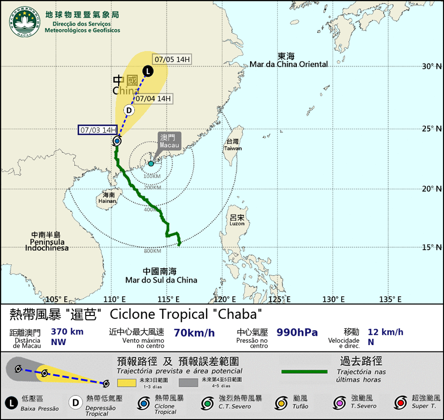 Under the influence of the circulation of "Chaba", there will be strong winds in Macao this afternoon and the winds will occasionally reach wind force level 6. As a result, typhoon signal No. 3 will remain in force in the afternoon. Weather remains unsettled, with heavy showers and thunderstorm at times, and possible rainstorm. The public should pay attention to our latest weather information.
